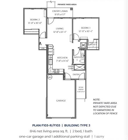 - This single ground level 2 bedroom, 1 bath condominium flat consists of 846 square feet of net living area. Step in from the entry lanai and enter the open concept living room and kitchen. Off the kitchen is the primary bedroom with a walk-in closet and a nearby bathroom with a vanity sink and walk-in shower. Across the living room, the secondary bedroom has a generously sized closet with mirrored sliding doors. Attached to this home is a single-car garage (also comes with 1 open parking). Air conditioning and modern appliances including a range/oven, micro-hood, dishwasher, refrigerator, and washer/dryer allow for ease of living.