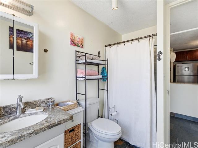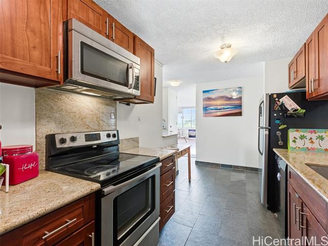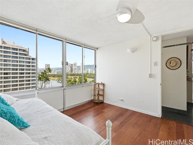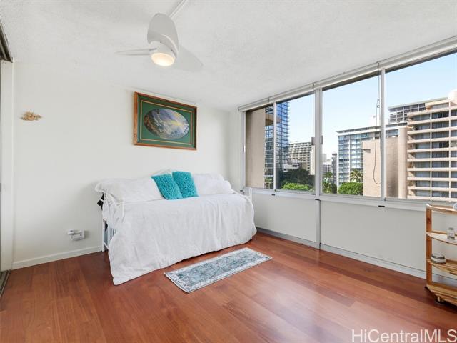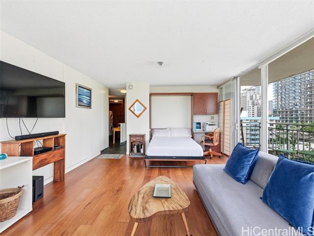 - Nicely remodeled, most desirable -01 corner stack in the building, with wide-open, gorgeous mountain, golf course, and Ala Wai views. Beautiful engineered hardwood floors and granite countertops. Own this unit in Fee Simple when you buy both the Leasehold Interest and the currently offered Fee Interest at $104,504. Originally a 2-bedroom, this unit now functions as a large 1-bedroom with a huge living room. It could be converted back to a 2-bedroom, but the current layout feels nice and roomy. Includes a washer/dryer and one covered, secure parking stall.