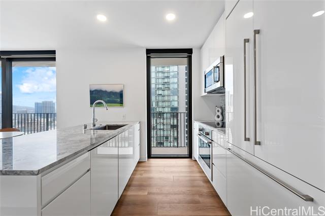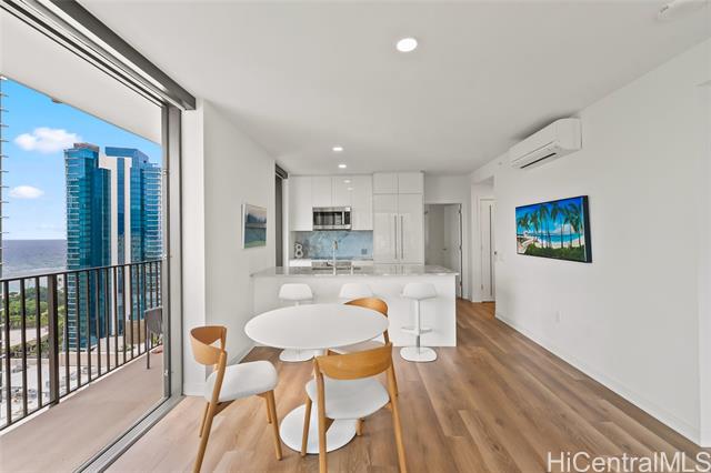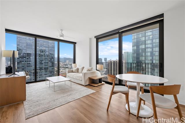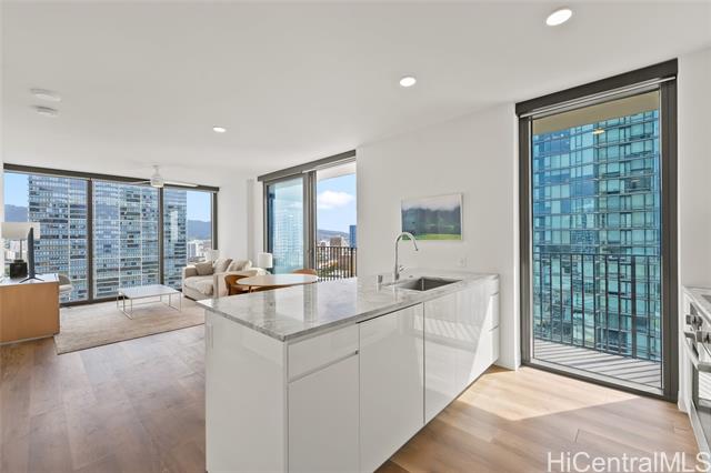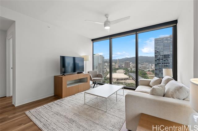- Aggressively priced below recent sales, best Ward Village opportunity. Sweeping views from this rarely available prime corner end-unit in desirable Aalii, featuring one of the building’s most sought-after 2-bedroom floor plans. This residence offers a unique tri-view perspective from the living room with ocean, mountain, and city views—a rare combination made possible by its corner orientation and expansive floor-to-ceiling windows. The layout provides excellent bedroom separation for added privacy, ideal for both everyday living and hosting guests. Step onto the lanai to enjoy ocean views overlooking Kewalo Basin Boat Harbor, adding a dynamic coastal element to the urban setting. This home is enhanced with custom built-ins, electronic blinds, and upgraded California Closet storage solutions throughout. Offered fully furnished and turnkey, the residence allows for effortless move-in or immediate enjoyment as a second home or investment. Storage included with the unit. Ideally located within the award winning master-planned community of Ward Village, Aalii offers resort-style amenities and convenient access to beaches, dining, shopping, and Honolulu’s premier lifestyle destinations.