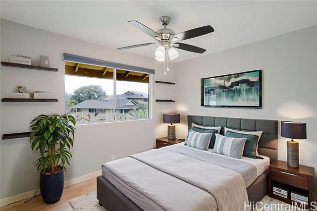 - You're in the heart of it all! Welcome to this gem tucked away at The Ridge at Launani Valley with a massive opportunity: the existing VA loan is assumable for all qualified buyers at a 4.25% interest rate and ~$35k gap (No VA entitlement needed). Just steps from your door, enjoy two dedicated parking stalls. The entire unit was transformed in 2022 with an eye for modern, easy-living. Feel the cool, elegant touch of porcelain tile flooring that flows right into the cozy comfort of gorgeous luxury vinyl plank. The kitchen features sleek quartz countertops that make meal prep feel downright luxurious. You’ll live for the community pulse, the seasonal farmers markets, and the summer concerts in the park, along with an easy commute to Schofield Barracks and Wheeler. Come feel the difference!