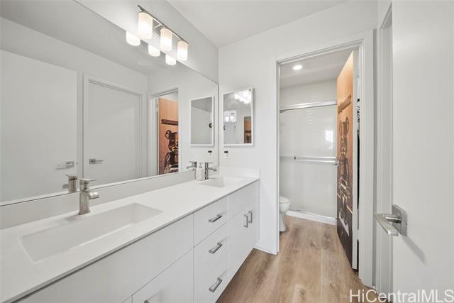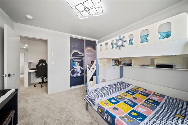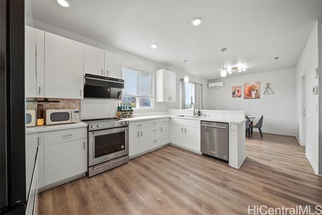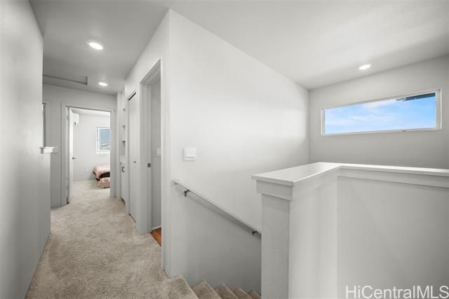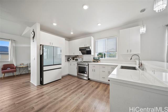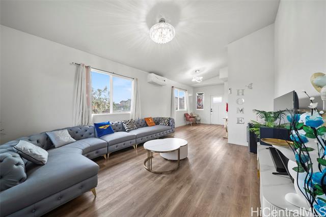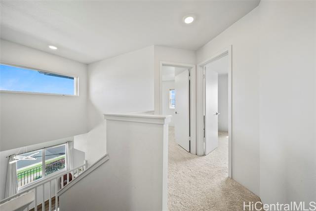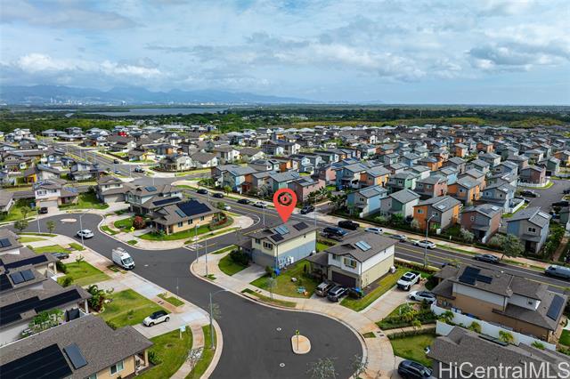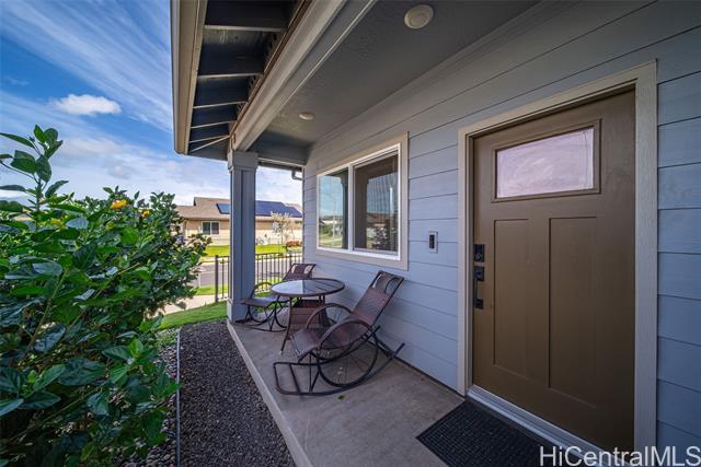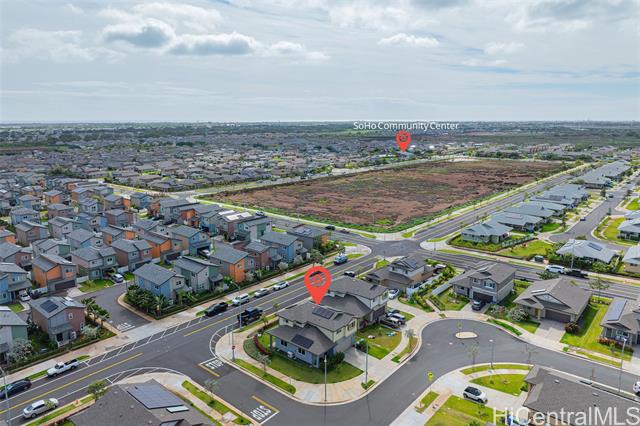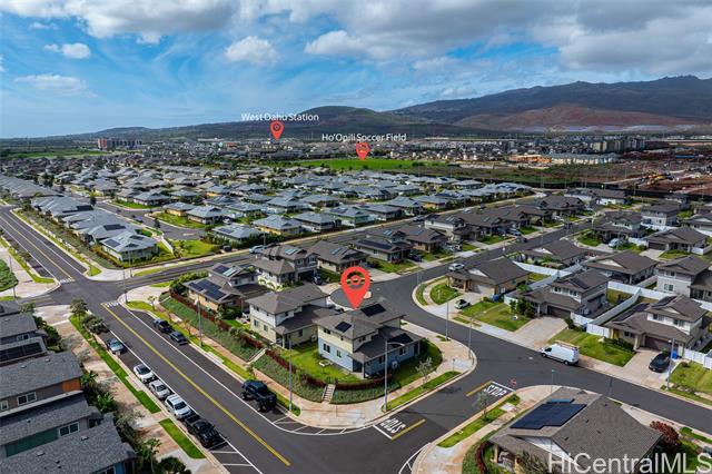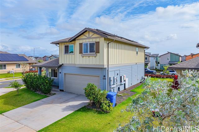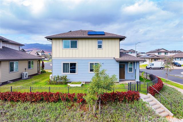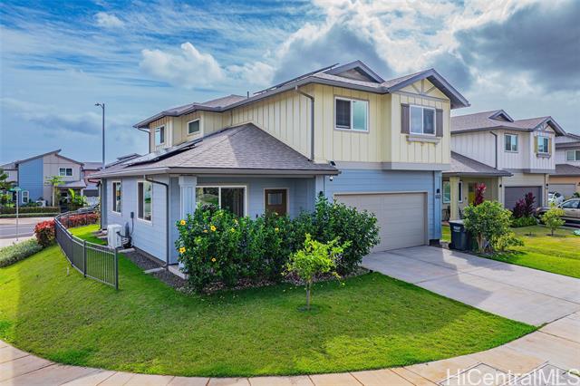 - Located in Ho‘opili Kanalani, this 4-bedroom, 2.5-bath single-family home offers modern island living in a lower-density neighborhood with wider streets and longer driveways. Situated on a corner lot, this move-in-ready home features 1,720 sq. ft. of well-designed living space with two downstairs living areas, including a vaulted-ceiling living room and a separate family room open to the kitchen. The kitchen features white soft-close cabinetry, solid-surface countertops, stainless steel appliances, peninsula seating, and vinyl plank flooring throughout the downstairs and bathrooms, with plush carpeting upstairs. The second floor includes four bedrooms, two full baths, a built-in tech desk, and a primary suite with dual sinks and a walk-in shower. Additional highlights include split A/C, leased solar system, solar water heater, high-tech range hood, and a large interior walk-in pantry/storage room. Centrally located within Ho‘opili near the SoHo Community Center, soccer field, and Honolulu Skyline rail stations, with easy access to shopping, dining, and schools. A rare opportunity to own in one of Ho‘opili’s most thoughtfully planned neighborhoods.