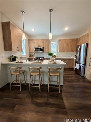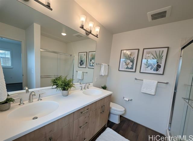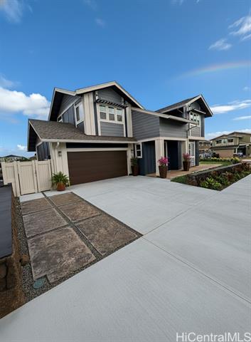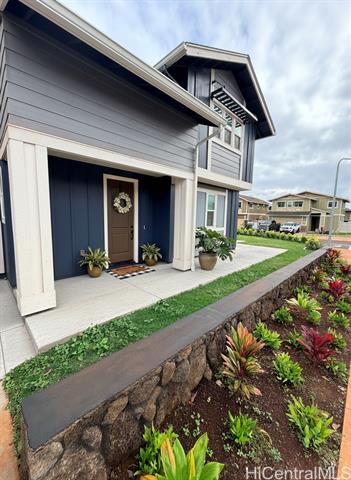 - This barely lived-in home, with ALL the upgrades & landscaping in place, is located in one of Central Oahu’s most sought-after communities, Nanea II. It offers 3 bedrooms, 2.5 baths, plus a spacious den/loft that can easily be converted into a 4th bedroom. Positioned on a desirable corner lot, the home enjoys added privacy, light, and curb appeal. With nearly $100,000 in upgrades, this home is priced competitively with new construction offerings that include no upgrades or landscaping, making it a rare opportunity for the discerning buyer seeking immediate value. Luxury vinyl plank flooring flows seamlessly throughout the entire home, complemented by quartz countertops, plantation shutters throughout, and added custom cabinetry in the entryway. An extra-large upstairs storage room adds even more flexibility for organization, hobbies, or seasonal items. The open layout transitions effortlessly to the outdoors, where a covered extended lanai, custom tropical landscaping, and lava rock retaining wall create a low-maintenance yet lush setting perfect for entertaining or unwinding. Full rain gutters and professionally designed landscaping complete the exterior upgrades.