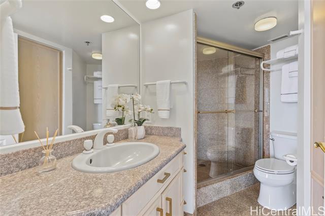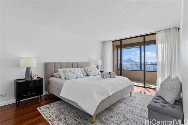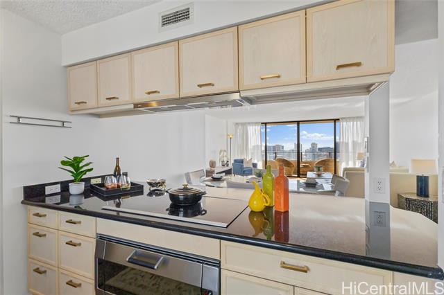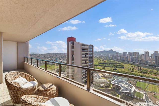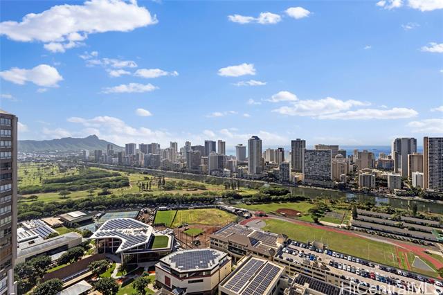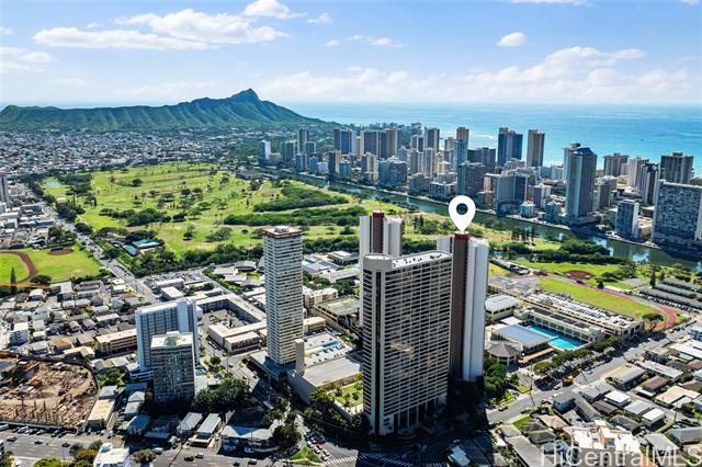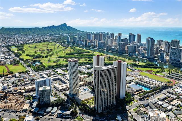 - High-floor 38th-level 2BD/2BA residence in the Ewa Tower at Royal Iolani, offering approx. 1,147 sq. ft. of interior living space plus a 318 sq. ft. lanai with panoramic views of Diamond Head, the ocean, Waikiki, and Ala Wai Golf Course from every room. With only four units per floor, this is the only unit with true cross-ventilation, creating a bright and airy open layout with a recently updated interior. The spacious lanai is ideal for enjoying sunsets and Friday night fireworks. Iolani School is located directly next door with no major streets to cross, a rare convenience in Honolulu, and the property is also minutes from UH Manoa and Punahou School. Resort-style amenities include a heated pool, jacuzzi, fitness center, sauna, tennis courts, EV charging stations, and ample guest parking. Maintenance fee covers all utilities, including central A/C, electricity, water, sewer, cable, and internet. Recent building improvements include new elevators and completed wastewater pipe replacement. Pet-friendly (buyer to verify). Prime location near Waikiki beaches, dining, shopping, and daily conveniences.
