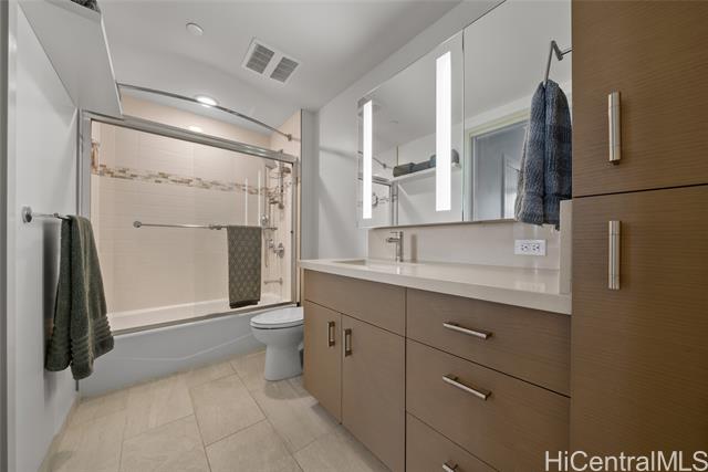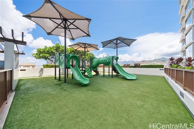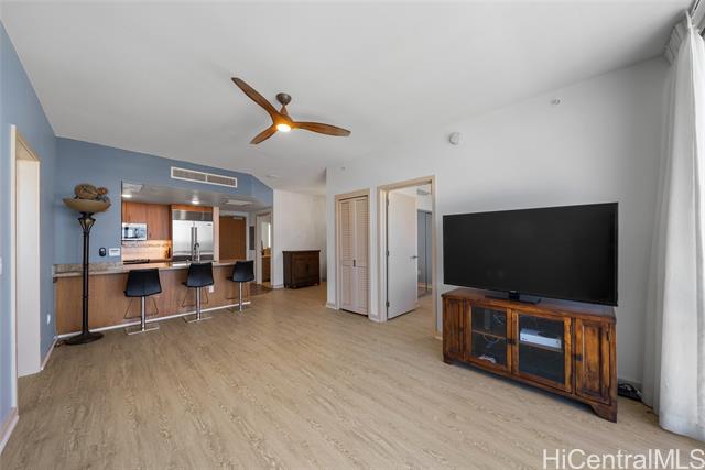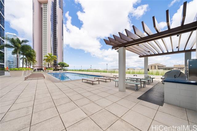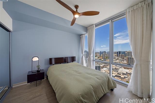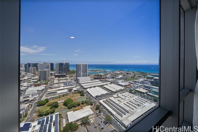 - NEW PRICE! Priced Below Assessed Value! Experience elevated island living in this stunning high-floor residence in the heart of Kakaako. Just one floor below the penthouse, this spacious 2-bedroom + den, 2-bath unit offer the best value in the building. Enjoy sweeping ocean and city skyline views from the cooler, more private side of the building. with soaring ceilings and abundant natural light, this home exudes a tranquil, airy ambiance. Thoughtfully upgraded with high-grade laminate flooring, Sub-Zero refrigerator, elegant chandelier, closet organizers, ceiling fans, and double curtains. The flexible floor plan features split bedrooms for added privacy and a versatile den-ideal as a dining area, home office, or reading nook. The generous primary suite includes a walk-in closet. Enjoy two secured covered parking stalls and access to resort-style amenities: heated saltwater pool, hot tub, gym, playground, BBQ areas, and more. This pet-friendly building also offers bike and surfboard storage. Conveniently located near Downtown Honolulu.