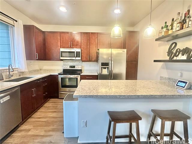 - A really amazing opportunity to buy into desirable Haloa at Hoopili! These townhomes are located closer to the parks for the kids and pets. Haloa has a larger, more open floorplan feel with no units above or below and spacious open concept living, a large primary bedroom and bath with custom IKEA walk in closet, a welcoming front yard and buffering back yard. Modern touches for the new owner, such as open shelving, drop down knife drawer, and even a self-watering living wall. Additionally, this unit is well located close to guest stalls, street parking, and a landscaped pet relief area adding to the easy going open air feel of this home. Water & Sewer seperately metered for each unit. Come see and compare - feels as spacious as a single family home!