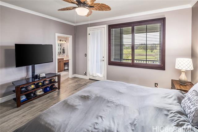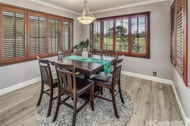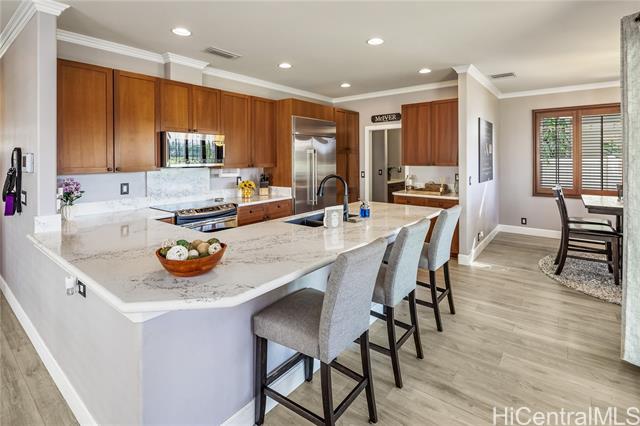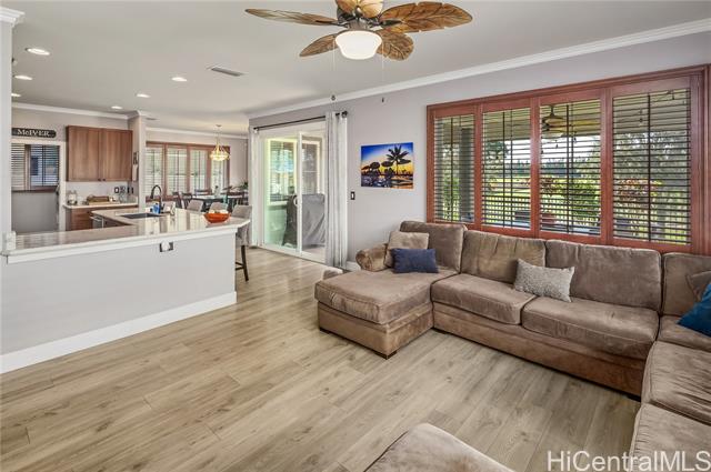 - A refined golf-course–front residence offering generous living spaces and thoughtful updates throughout. Located minutes from the beach park and a major shopping center with grocery, dining, and everyday conveniences, this home balances leisurely retreat with practical living. Four bedrooms include a private ground-floor suite with a full bath—ideal for guests or multigenerational needs—while a welcoming Ohana room on the second floor creates a bright, flexible gathering space. Plantation shutters accent nearly every window, lending a tailored, finished look. Recent improvements include a three-year-old HVAC system (new evaporator and condenser), a 2024 GE Profile refrigerator, updated microwave, brand new solar hot water heater and an easy-care artificial lawn framing the backyard. Situated in a friendly, distinguished community with no onerous HOA fees, the property comes with a pre-listing inspection; the inspector is available to walk the home at no cost to buyers upon opening escrow. Ready for discerning buyers seeking comfort, style, and convenience.