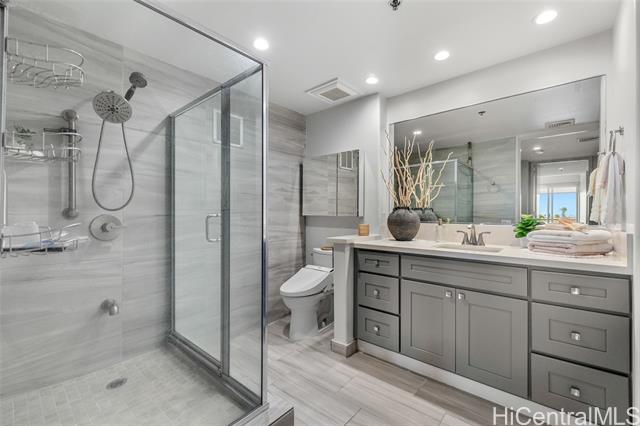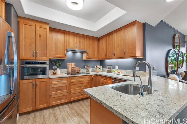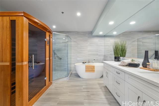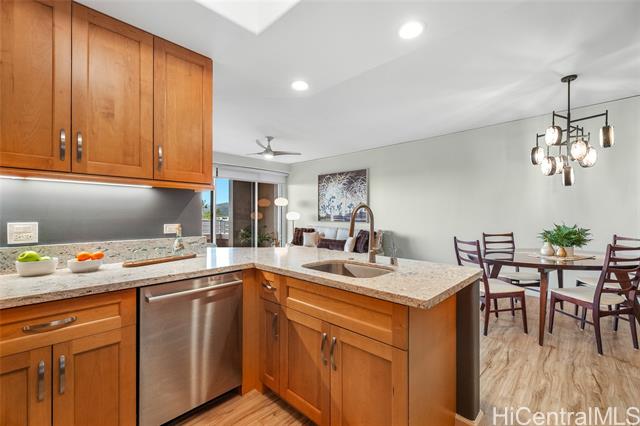 - Elevated Island Living - Welcome to paradise and discover your own retreat in the marina-front community of Kalele Kai. This inviting 1,427 SF, 2-bedroom, 2-bath residence, located on the 5th floor of a 6-story building with 2-covd parking stalls, offers a comfortable place to call home with a spacious living and dining area. Thoughtfully designed with a spa-inspired primary bathroom featuring a private sauna, soaking tub, and Toto washlet bidet toilets, this home encourages rest and renewal. The generous 265 SF covered lanai extends your living space and creates a perfect setting for morning coffee or tea and evening sunsets where warm coral & amber tones stretch across the horizon above the ocean & marina, with Diamond Head silhouetted in the distance. Interior features include vinyl plank flooring, custom cabinetry & lighting, closet systems, stainless steel appliances, water filtration system & a dedicated laundry room. Kalele Kai offers 24/7 gated security, marina access, pool, BBQ area, clubhouse, on-site resident manager, car wash area. Tucked away and conveniently close to Safeway, CVS, Costco, City Mill, Hawaii Kai Towne Ctr, dining, beaches, hiking, & everyday essentials.