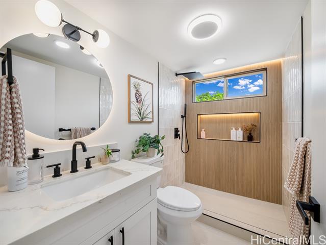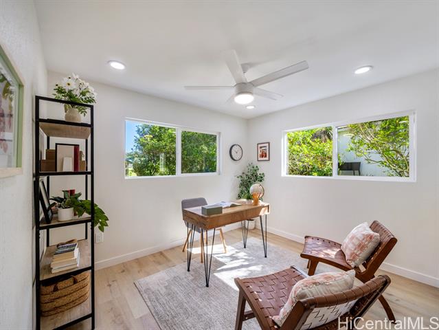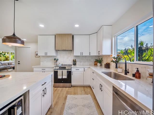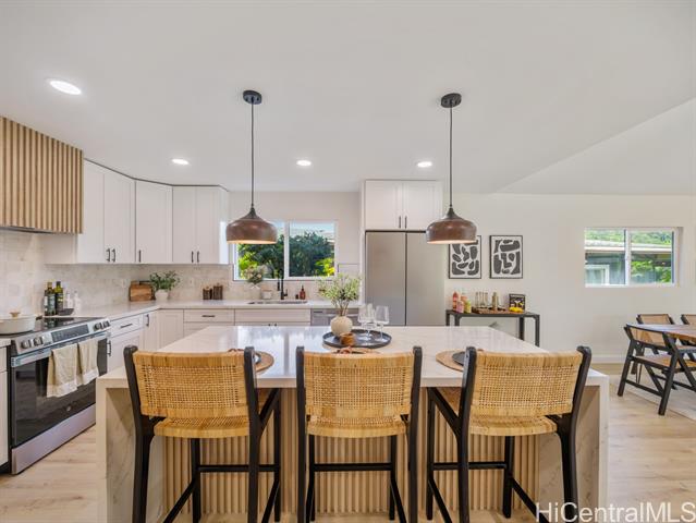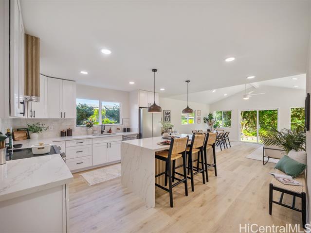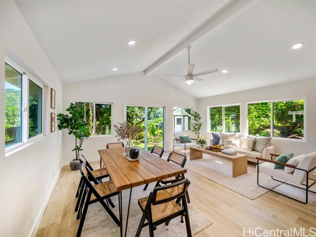 - Step into the perfect blend of modern comfort and serene island living with this fully renovated 4-bedroom, 3-bathroom property in Ahuimanu. Nestled on a highly desired quiet dead-end street with great curb appeal, this home offers a peaceful and lush setting with Ko’olau mountain views, sidewalks + underground utilities. Spanning 1,871 square feet of beautifully designed interior space, this home welcomes you with an open layout filled with natural light. With two inviting living areas, there’s plenty of room to relax or entertain. Enjoy an indoor-outdoor feel from your living room out to your large 7,130 sf lot and the privacy of having no back neighbor. Every detail has been thoughtfully updated to ensure both a high level of design and functionality. Enjoy the perks of being apart of Ahuimanu Community Association with access to the clubhouse, salt water pool, and nearby park. Just moments away from the convenience of Temple Valley Shopping Center and a quick drive to Windward Mall. Plus, with easy access to Likelike and H3 highways, commuting or exploring the island is a breeze.