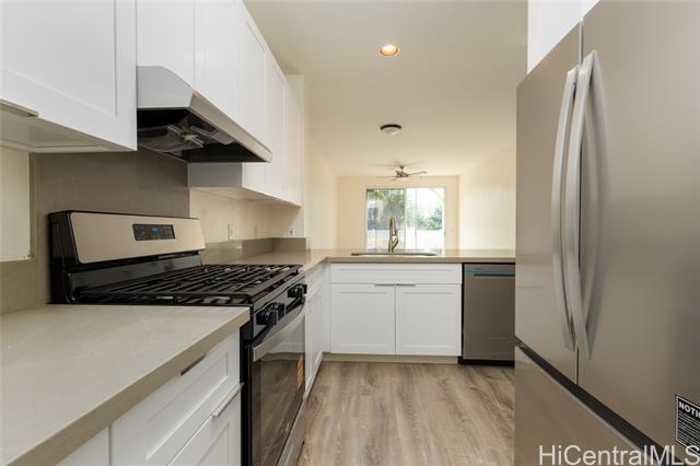 - VA-friendly opportunity for Military Buyers! Welcome to Kekuilani Villas — a charming community in the heart of Kapolei! This 2-bedroom, 2-bath, 2-parking townhouse offers spacious living with nine-foot ceilings, luxury vinyl flooring, and fresh interior paint. The recently renovated kitchen features brand-new shaker cabinets, quartz countertops, and all-new appliances. The primary bedroom includes an ensuite bathroom for added comfort. Enjoy access to the Villages of Kapolei Community Center and pool. Conveniently located near Ka Makana Ali‘i Shopping Center, Kapolei Golf Course, parks, and restaurants, this is a wonderful opportunity to make it your own home or an investment property.