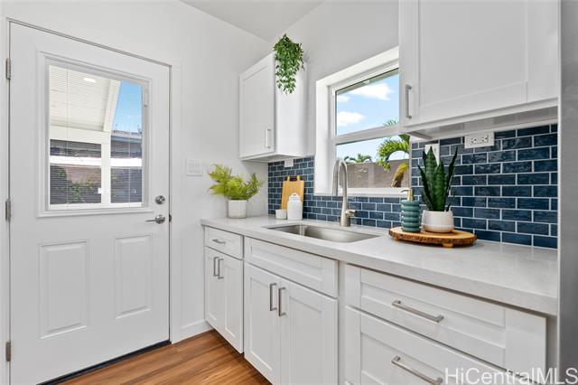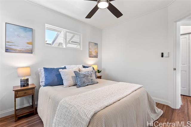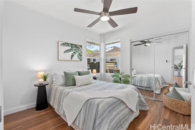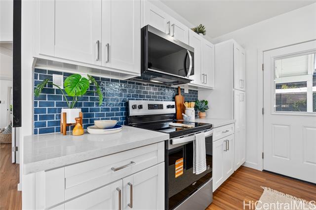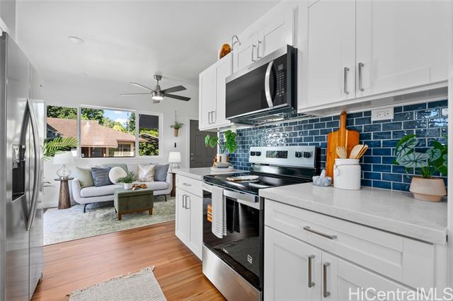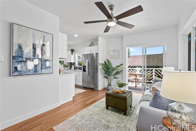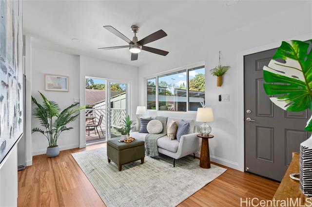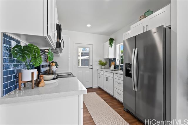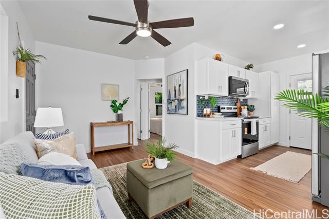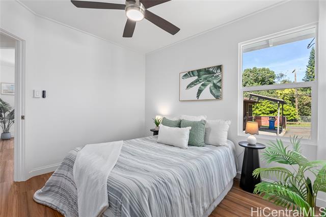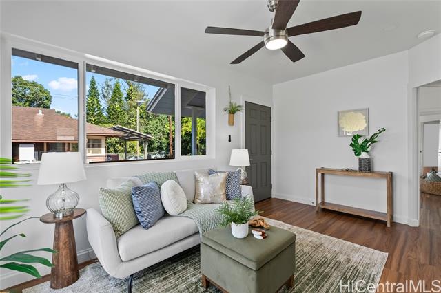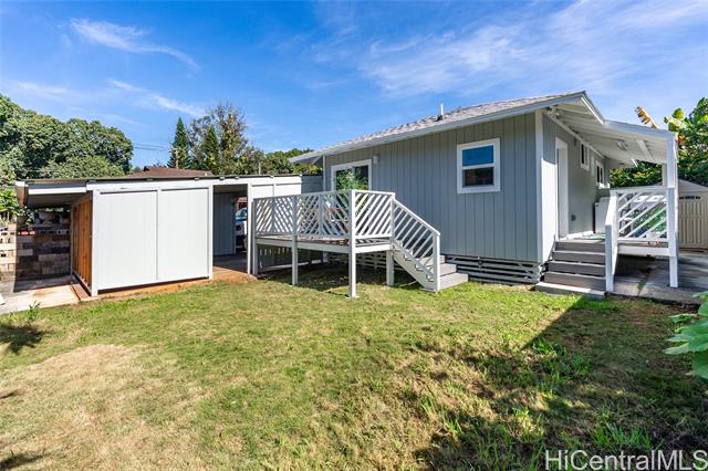 - Welcome to 1281 California Ave #3, a fully renovated and redesigned 2bd/1ba home offering the feel of modern new construction with the charm of its original cottage style feel. Taken down to the studs and reimagined, this former home now features new exterior siding and trims, new windows, a new asphalt shingle roof, hurricane clips, full drywall, updated plumbing, and new electrical — essentially creating a modern home. The open-concept living area flows into a brand-new kitchen with stainless steel appliances, tile backsplash, new cabinetry, quartz countertops, and recessed lighting. Warm wood vinyl flooring runs throughout. The fully redesigned and renovated bathroom and large bedroom closets complete the interior. A new sliding door opens to a deck and fully fenced yard, plus a covered rear lanai for added living space. The enclosed two-car carport fits two full-size vehicles with room for storage. Set back from the street as the rear home down a private driveway, this property enjoys added privacy and a peaceful setting. No maintenance fees and an exceptional value in Wahiawa.