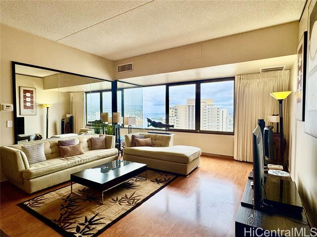 - Rarely available, beautifully renovated penthouse at Chateau Waikiki offering soaring 9.5-foot ceilings and breathtaking panoramic views of the ocean, and vibrant island city views. This spacious, fully furnished, move-in-ready residence features newer flooring, updated kitchen cabinetry, and a bright, open-concept layout designed for effortless island living. Enjoy elevated views of paradise from your high-floor vantage point, perfectly positioned near the entrance to Waikiki for exceptional convenience. You’re just minutes from world-famous Waikiki Beach, Ala Moana Center, and Ala Moana Beach Park—ideal for premier shopping, dining, and outdoor recreation. Chateau Waikiki offers an impressive suite of resort-style amenities, including a swimming pool, BBQ area, fully equipped gym, sauna, recreation rooms, car wash area, and 24-hour security. Maintenance fees include electricity, central AC, cable, water, sewer, providing exceptional value and peace of mind. The unit includes TWO parking stalls (tandem) and additional storage! Don’t miss your chance to own this exceptional penthouse in one of Waikiki’s most desirable locations.