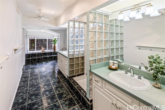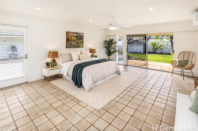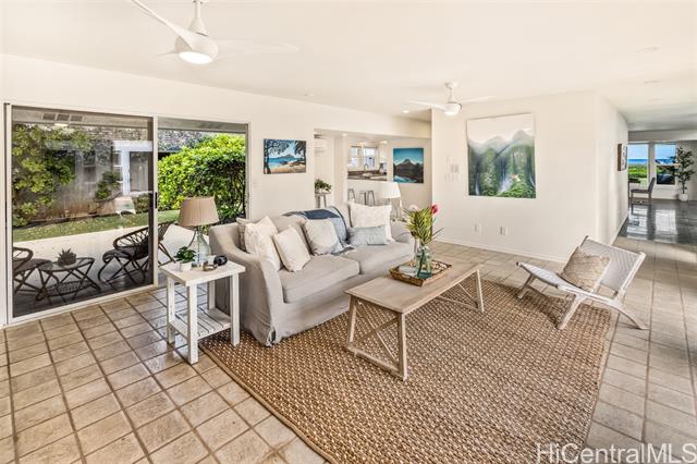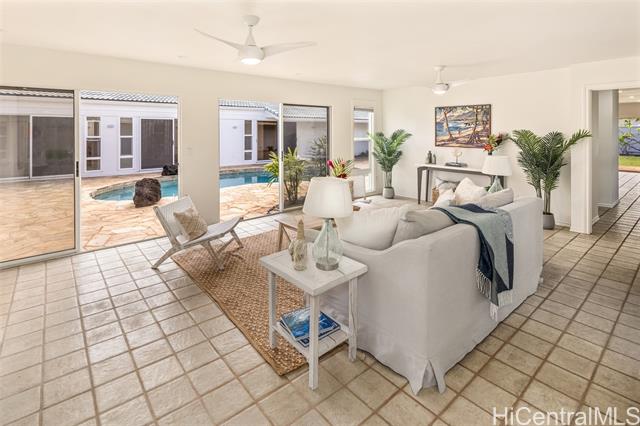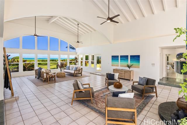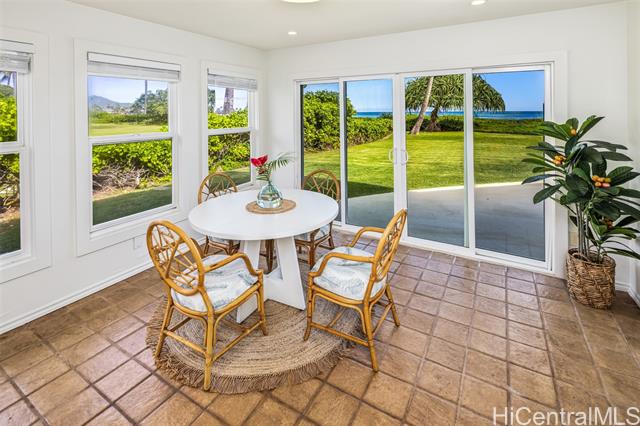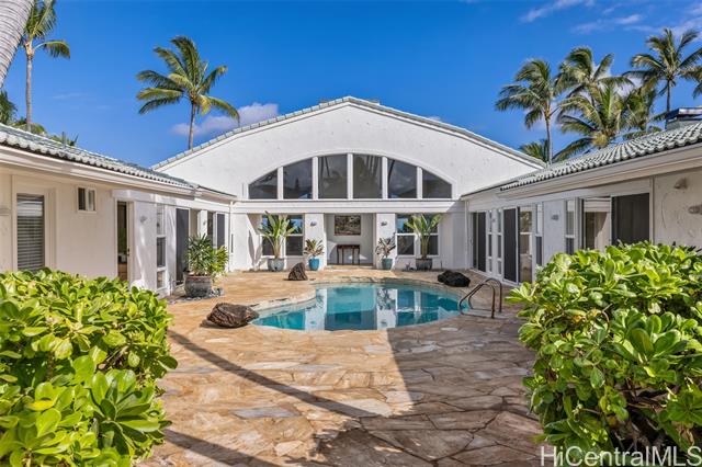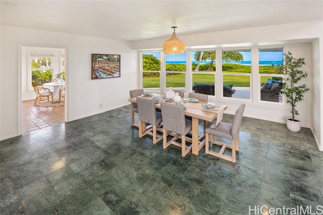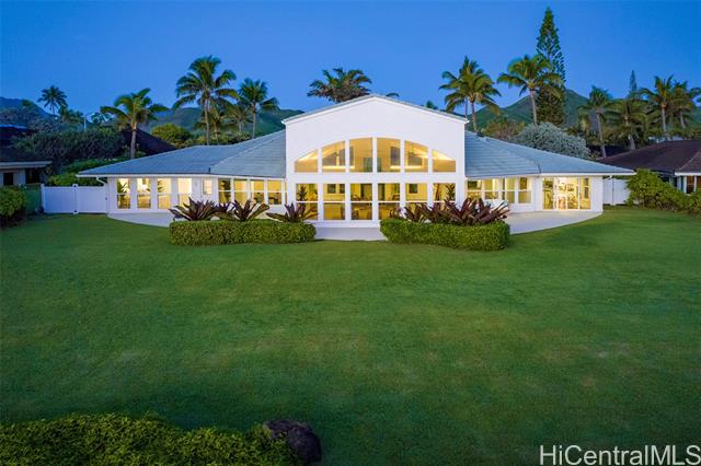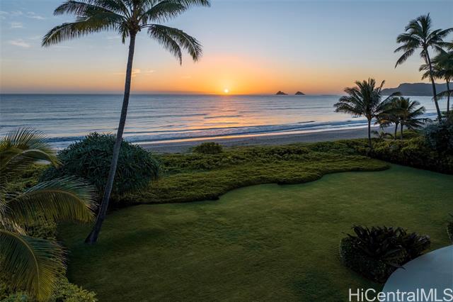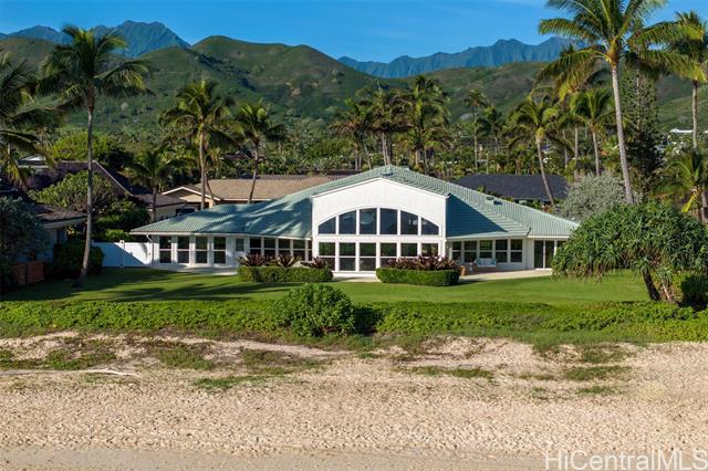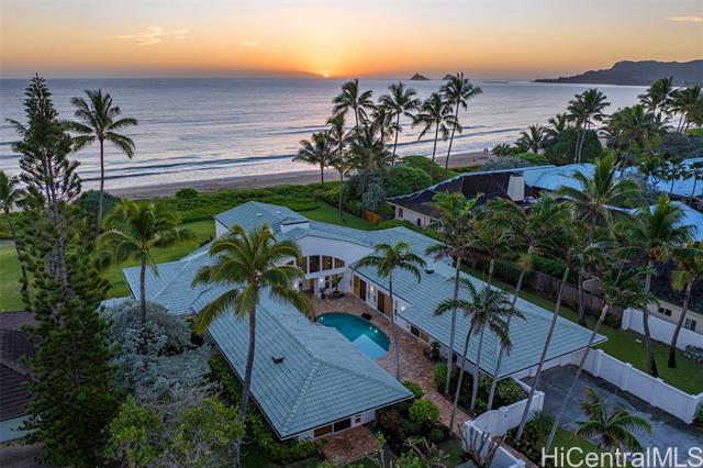 - Great value in this beachfront estate in Kailua's highly sought after Kainalu Park neighborhood fronting famous Castle Beach with approx. 27,293 sq. ft. of land, an expansive oceanside lawn, and 125 linear feet of sandy beach frontage. The curb appeal is stunning, accented by tropical landscaping, outdoor lighting, and aesthetically designed front wall with double gates. With 5 bedrooms and 4.5 baths, this spacious home has 5,201 sq. ft. of interior living space that opens out to a blue tile pool and flagstone courtyard. The soaring open beam ceiling in the main living room area takes in the ocean views from the floor-to-ceiling windows. This home features 2 primary suites and two other large ensuite bedrooms. The fifth bedroom may also be used as an office/den. The main primary suite features two oversized walk-in closets and ocean views. The open kitchen recently updated with new appliances. Adjoining to the kitchen are 2 oversized walk-in pantries. Recent upgrades include complete exterior and interior paint, a newly coated roof with new solar vents, new lighting and ceiling fans, and refreshed landscaping that features a commercial grade sprinkler and irrigation system.