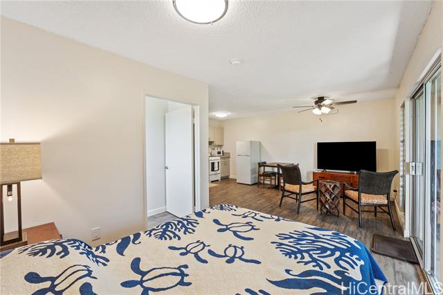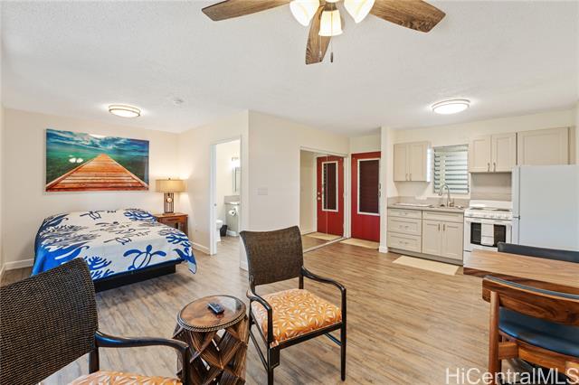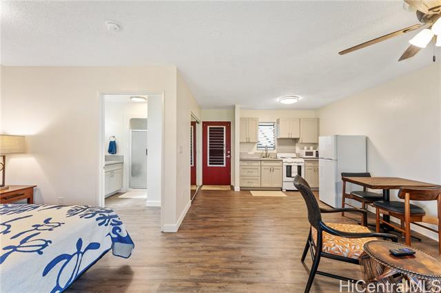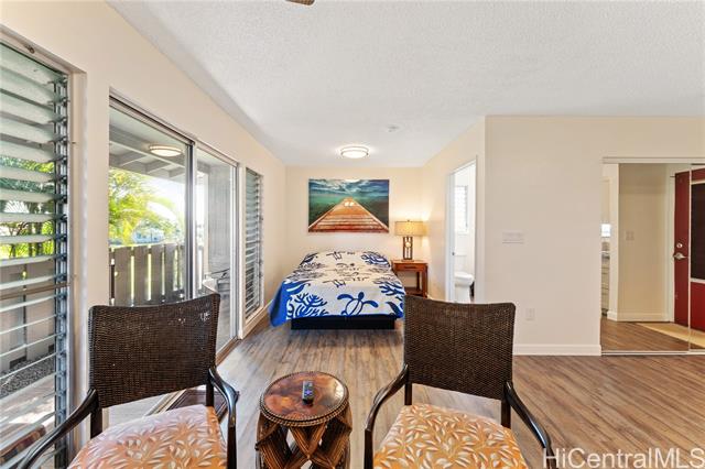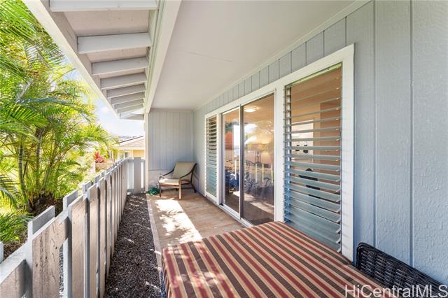 - Well-maintained ground-floor end-unit studio in a 55+ independent senior community in Mililani. Single-level and quiet, with no upstairs neighbors and unrestricted ownership. Extra storage closet located just outside the unit. This newly renovated condo features a private palm-shaded lanai with morning sun and mauka breezes. Renovations include hardwood cabinetry, granite countertops, new appliances, toilet, vanity, emergency lighting, LED lighting, and ceiling fan. Flooring was professionally floated by a union mason and finished with new commercial-grade vinyl. Bright, clean, and move-in ready. Conveniently located near the gym and recreation center. Community amenities include gated entry, green space, clubhouse, and planned activities such as exercise classes and line dancing; amenities unique to Olaloa compared to other Mililani condo projects. Furniture available with sale; owner is in the furniture business and most contents are negotiable with full-price offer. Sold As Is. Rarely available.