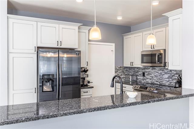 - This beautifully upgraded single-level home is located in the desirable Kawena at Mehana community in Kapolei. The property features a fully remodeled kitchen with granite countertops, modern cabinetry with soft-close doors, built-in pullouts, and stainless-steel appliances. The open-concept floor plan provides seamless flow between the living, dining, and kitchen areas, making it ideal for everyday living and entertaining. Thoughtful upgrades throughout include new vinyl plank flooring, polyresin shutters, newly installed gutters, and a Mitsubishi split system AC for enhanced comfort. Additional energy-efficient improvements include leased solar panels and a solar water heater. The home also offers a Vivint alarm system, three spacious bedrooms, two bathrooms, and freshly painted interior and exterior finishes. Residents of Mehana enjoy access to community amenities including a pool, basketball courts, dog park, bike paths, restaurants, shops, and nearby medical facilities. Conveniently situated, this home is just minutes from Ka Makana Ali‘i Shopping Center, the Kroc Center, freeway access, rail transit, and the Ko Olina Resort area.