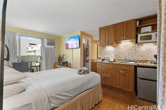 - Just two blocks from the beach, this LEGAL short-term rental condo with an OCEAN VIEW offers a rare opportunity to own in the heart of Waikiki. Thoughtfully designed for both comfort and functionality, the open-concept layout flows into a welcoming living space, while large windows and a private lanai capture natural light, island breezes, and relaxation. Perfectly positioned near world-class dining, shopping, entertainment, and Waikiki's iconic coastline, this property is ideal as a vacation getaway, income-producing investment, or part-time island retreat. The combination of a legal short-term rental designation and ocean view makes this unit a standout in one of Oahu's most sought-after neighborhoods. The building features secure entry, a resident manager, and night security, offering peace of mind whether you're relaxing or generating rental income. This is a Leasehold property.