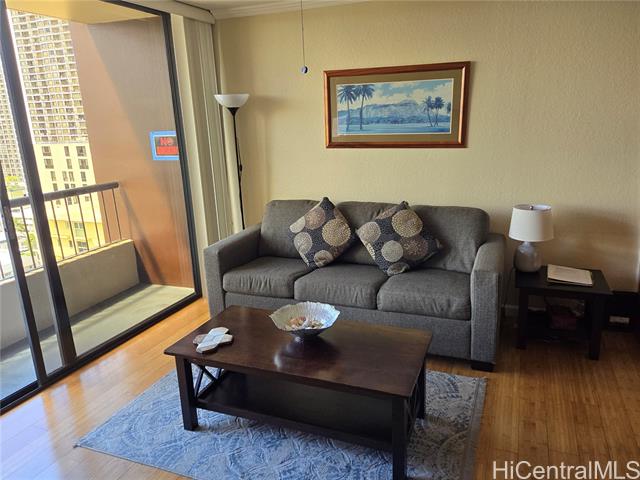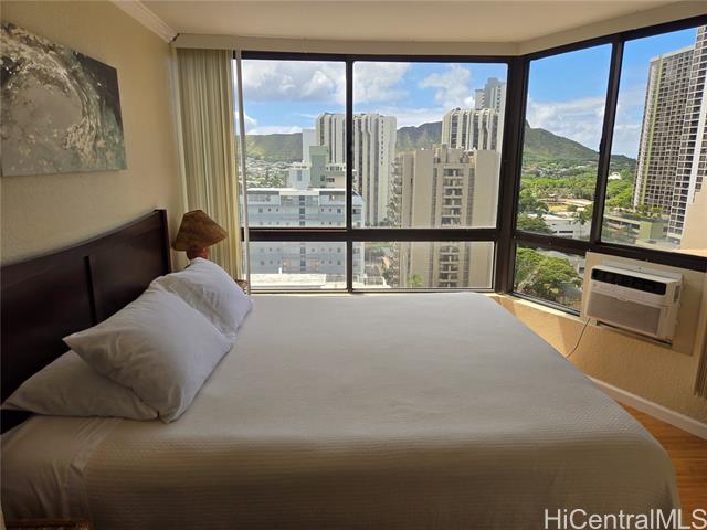 - Lucky you, getting the best priced and iconic views of the Diamond Head, Ala Wai Canal, mountains, and partial ocean in this very popular building. This charming, 18th-floor, 2-bedroom, 1-bath, corner and end unit is upgraded with flooring and cabinets and an open kitchen experience. A special place that is well-maintained and secure. The assigned covered parking is close to the elevator. Amenities are a swimming pool, BBQ, and a recreation deck. Located in the heart of Waikiki, you can enjoy walks to the famous Waikiki Beach, shops, and restaurants. First Open House 2/8 200pm to 500pm. Vacant and easy to show. Don't miss this one. Schedule a showing today.