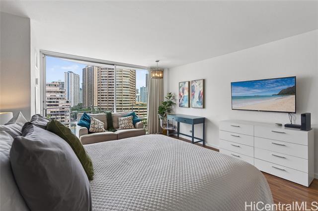 - Beautifully renovated high-floor studio in the desirable Ilikai Marina with a city lights view that truly shines at night. This flexible property allows short-term rentals, making it ideal as a second home, investment, or full-time residence—use it when you’re here and rent it out when you’re not. The unit features a private lanai and a convenient kitchenette with refrigerator/freezer, two-burner stovetop, and microwave. The building offers three restaurants downstairs and is perfectly located near Ala Moana Mall, Hilton Hawaiian Village, the boat harbor, and the Convention Center for any event needs. On-site parking is available for a small fee daily, nightly, or monthly, and this is a rare opportunity for rental flexibility in a prime Waikiki/Ala Moana location. Please see and use all supplements when submitting any offers. Legal short-term rental with annual DPP registration. Monthly fees: HOA $800.78, Special Assessment $45.53, Cable $58.46 (Total $904.77) plus electric and A/C (typically between $50-$100 combined per month).