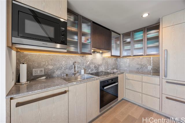 - Experience luxurious living at Ward Village’s development, Koula. Breathtaking sunsets await you in this serene 1BR condo, with a sliding living room door, offering a unique and open layout. Appointed with Miele appliances that blend seamlessly with custom cabinetry, wood flooring, and stone palettes creating a beautiful and luxurious living space. Also is upgraded to the toilet to a TOTO Washlet. Enjoy the magnificent amenities deck featuring a beautiful Lap Pool, 2 Spas, Poolside Cabanas, BBQ, Children’s Playground, Fitness Center, Guest Suites, Dog Park, Grand Room, and numerous other areas to relax and entertain guests. Situated in the heart of Ward Village, adjacent to Victoria Ward Park, shop at the local farmers market or WholeFoods around the corner, or dine at one of the unique and well-known restaurants in the neighborhood. Ala Moana Beach Park and Ala Moana Shopping Mall are all in close proximity.
