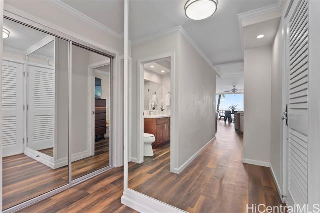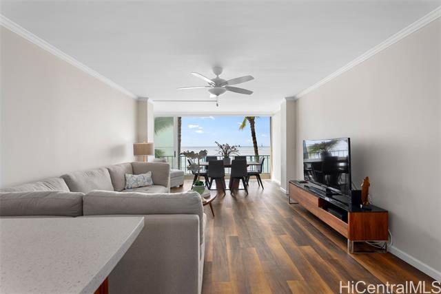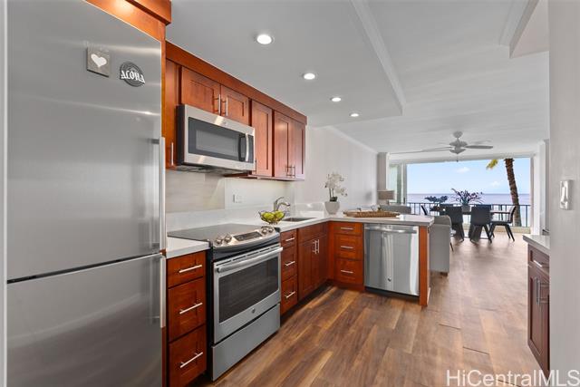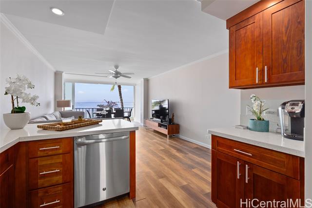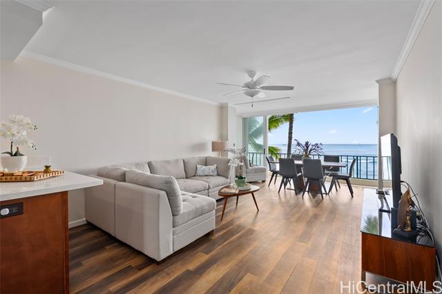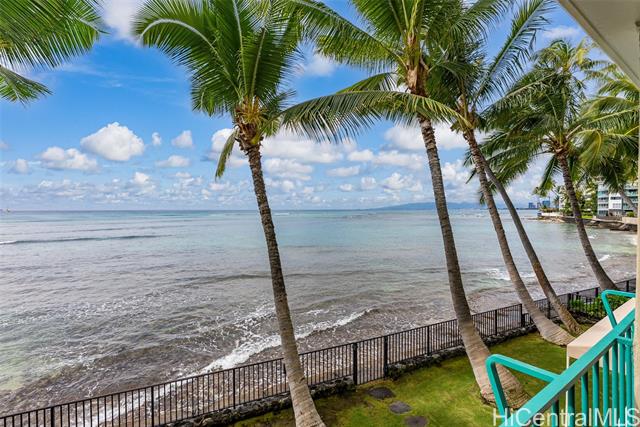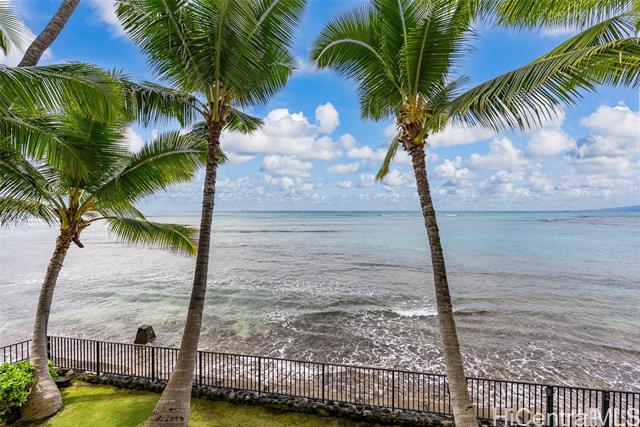 - This oceanfront condo on O'ahu's Gold Coast offers an unparalleled living experience, combining modern luxury with natural beauty. The sound of the waves, the stunning ocean and sunset views make for an an incredibly peaceful and rejuvenating experience. This completely and tastefully remodeled unit boasts new cabinets and quartz countertops, luxury vinyl floors, automatic blinds, new appliances, in-unit washer and dryer, smooth ceilings (no popcorn), crown molding. Fully furnished and situated in a secure building, this condo provides direct ocean access. Enjoy the convenience of Kapiolani Park nearby, along with world-class shopping, boutiques, and fine dining just minutes away. This waterfront jewel promises a perfect blend of comfort and elegance in a prime location. Coop taxes are included in the maintenance fee.