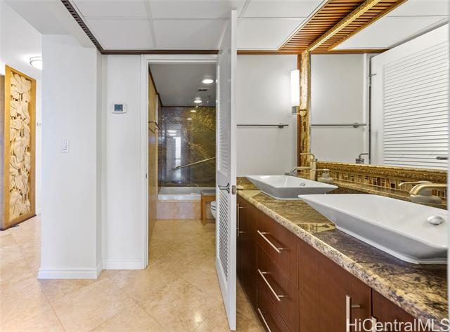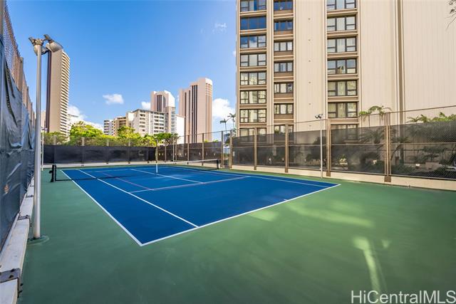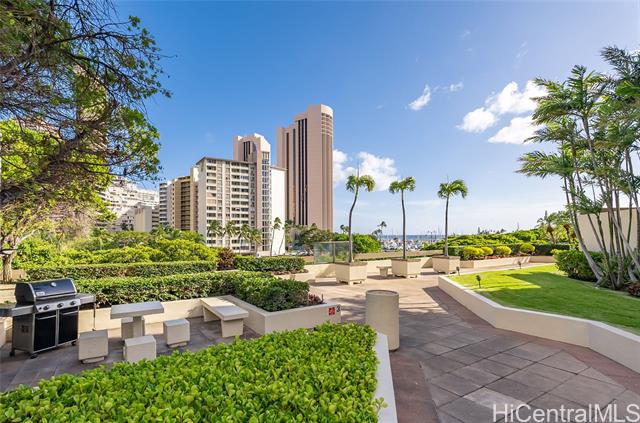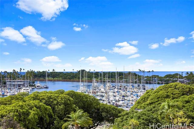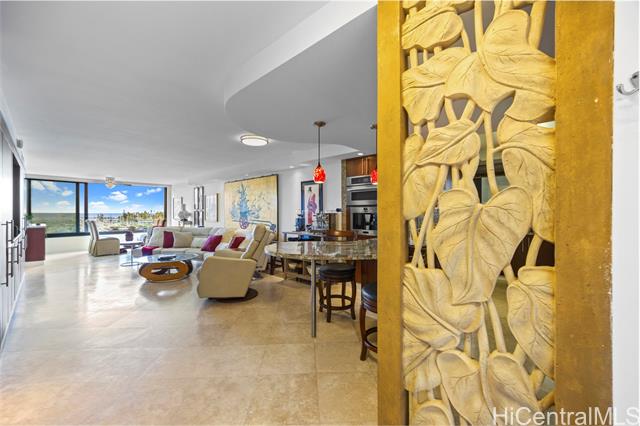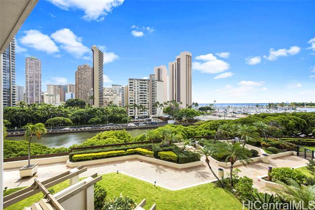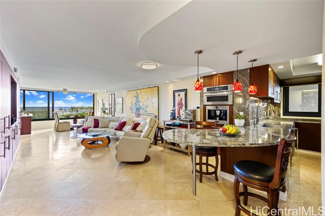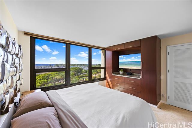 - Enjoy ocean, marina, and sunset views from this stunning and sophisticated apartment home. One of the larger one-bedroom floor plans in the building, the unit offers a bright open living area designed to maximize light and views. Thoughtfully and luxuriously renovated with quality materials and custom built-ins, the residence features travertine floors, warm wood cabinetry, and a fully equipped kitchen seamlessly integrated into the living space. The bedroom offers generous storage and is a peaceful retreat with large windows framing lush greenery and city views. Located at the gateway to Waikiki, just moments from Ala Moana Shopping Center, beach, and park, this well-maintained residence provides a comfortable and convenient island lifestyle. In the quiet Diamond Head tower of the complex, the apartment offers easy access to an array of amenities including swimming pool, whirlpool spa, barbeque/recreation area, and tennis court. An assigned and secure parking stall is close to the lobby entrance. Elegant furnishings are available.