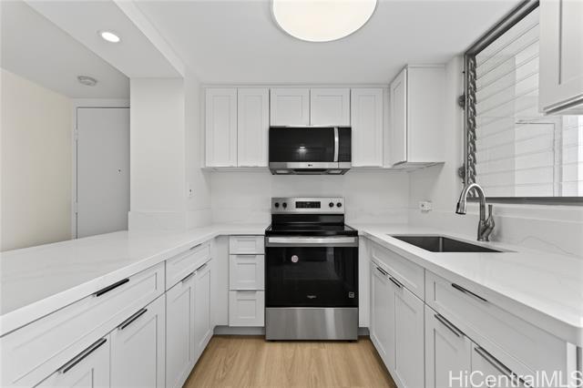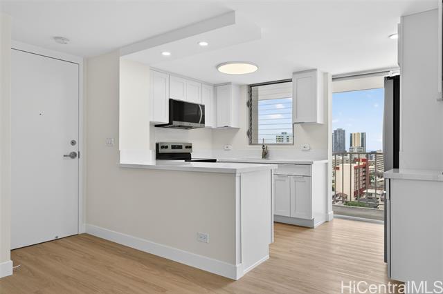 - MUST SEE! This beautifully renovated 2-bedroom, 2-bath + den corner residence at 1121 Wilder Ave #1000B has been completely transformed from top to bottom. The brand-new kitchen features sleek modern cabinetry, quartz countertops, stainless steel appliances, and fully upgraded plumbing and electrical. Both bathrooms have been fully redesigned with contemporary tile, vanities, and modern fixtures, new flooring, fresh paint, upgraded lighting, and smooth ceilings with popcorn removed throughout. Enjoy refreshing cool mountain breezes and city views from this end-unit, providing excellent privacy and natural light. Conveniently located minutes from Downtown Honolulu, Ala Moana, Ward Village, hospitals, and freeway access, this move-in-ready home is perfect for owner-occupants or those seeking a stylish in-town home.