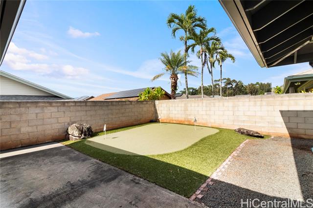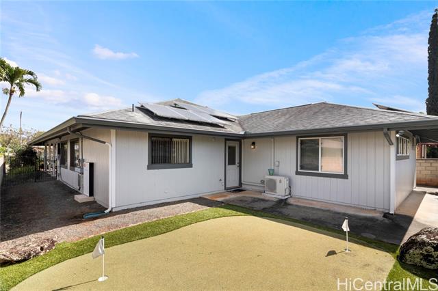 - Welcome Home to Mililani Mauka! Step into this rarely available 4-bedroom, 3-full-bath detached single-family home perfectly situated in the desirable Mililani Mauka community. With 2,058 sq. ft. of interior living space, this home boasts soaring vaulted ceilings, an inviting open-concept kitchen, and a spacious primary suite that includes a bonus ensuite with a wet bar and separate entrance - perfect for guests, multi-generational living, or a potential renter. Beautifully renovated and meticulously maintained, this home features a fully gated property, a low-maintenance yard, and your very own private putting green. Enjoy energy efficiency and sustainability with 43 OWNED PV panels, a Tesla battery, and a solar water heater, helping you keep electricity costs low. There are no HOA fees — just the Mililani Town Association membership, which provides access to 7 recreation centers, 5 pools, 12 tennis courts, and over 15 parks! Conveniently located just minutes from the freeway onramp, Costco, multiple shopping centers, and top-rated schools including Mililani High School, Mililani Middle School, and Mauka Elementary. Homes like this don’t come along often!