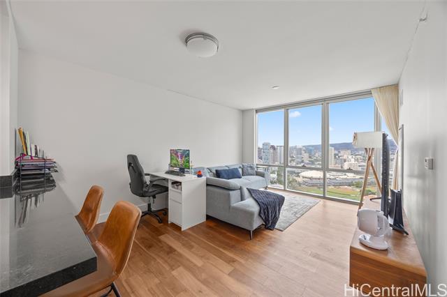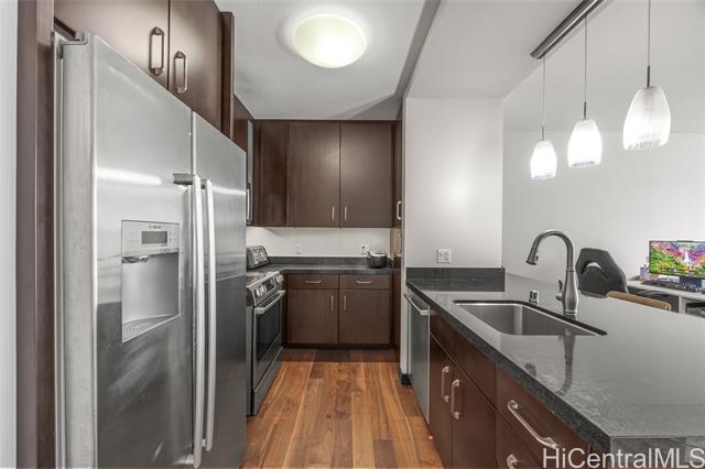 - Experience the pinnacle of urban living in this rarely available high-floor residence at Waihonua. Perched on the 40th floor, this sleek 1-bedroom, 1-bathroom home offers breathtaking, unobstructed vistas of the Honolulu skyline and the majestic Ko‘olau Mountains. The interior reflects modern elegance with floor-to-ceiling windows, rich hardwood flooring, and a gourmet kitchen featuring polished granite countertops and premium Bosch stainless steel appliances. Unlike many urban units, this residence offers the ultimate convenience: one dedicated parking stall and a private storage locker. Resort-Style Amenities Living at Waihonua means access to a private club-style environment. The 6th-floor recreation deck is your personal playground, featuring.