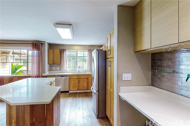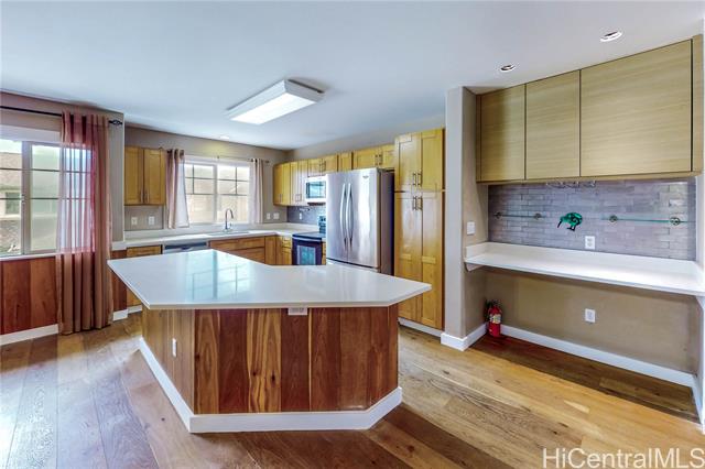 - Well-located 3-bedroom, 2-bath townhome in Nohona I at Kapolei, offering a functional layout and tasteful upgrades throughout. This residence features a spacious open-concept design with abundant natural light and a seamless living flow. Wood flooring is complemented by custom wood accents on the walls and kitchen island, creating a cohesive and modern interior. Bathrooms have been upgraded with tiled showers and wall tile finishes, and the primary bedroom includes a generously sized walk-in closet. The unit offers a 1-car garage with one tandem parking stall for added convenience. Community amenities include a recreation pool and well-maintained common areas. The property is pet-friendly (buyer to verify). Conveniently located near Ka Makana Ali?i, Kapolei Commons, Kapolei Regional Park, golf courses, beaches, dining, and shopping. Enjoy nearby walking paths and recurring community events throughout Kapolei, with easy access to major roadways and the H-1 freeway. This is a short sale and will be sold "As Is". Please add the Short Sale Agent Guideline (supplement) to all offers.