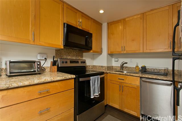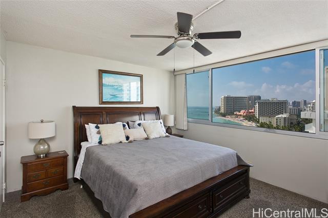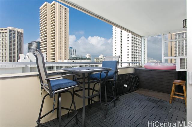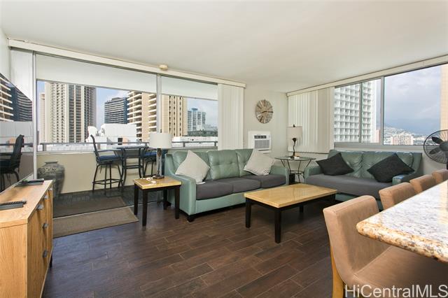 - No better location for a condo in Waikiki than right here. Located across the street from Waikiki Beach and nearby world class hotels, restaurants and shopping. This one bedrom condo has 814 sq. ft of interior living space with open floor plan. Modern kitchen with modern appliances. Beautiful porcelain tile floors that look like wood throughout the condo. Enjoy coffee in the morning on the 113 sq. ft lanai while you enjoy watching the morning surfers catch waves. Or enjoy a tasty beverage of your choice in the evening while enjoying a beautiful sunset. Condo is currently rented as a vacation rental. Minimum 30 day stay requirement as per HOA House Rules. Seller has not canceled bookings and they are transferable. All furnishings, pots/pans/linens, except for the Seller's surfboards and a few other items, are included. Washer/dryer in the condo. Amenities include renovated gym, new sauna and newly tiled pool and pool deck. Newly installed security system as well as 24 hour guard service.