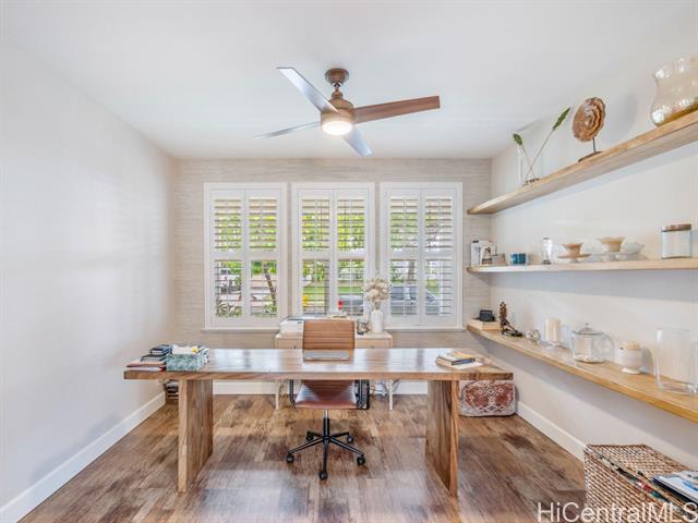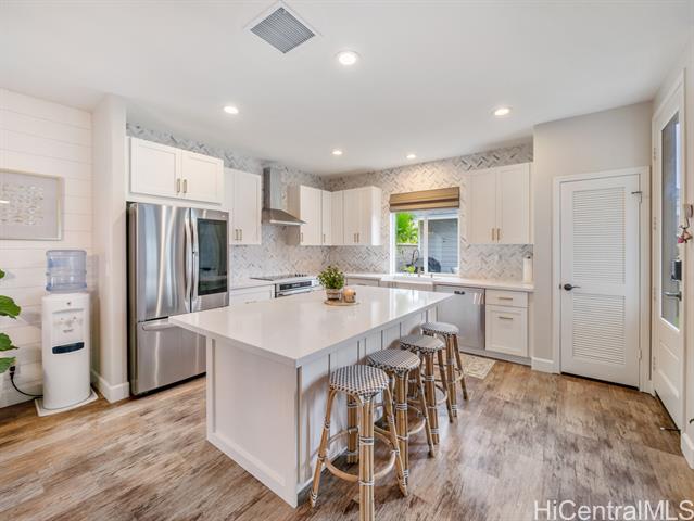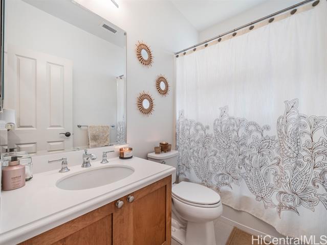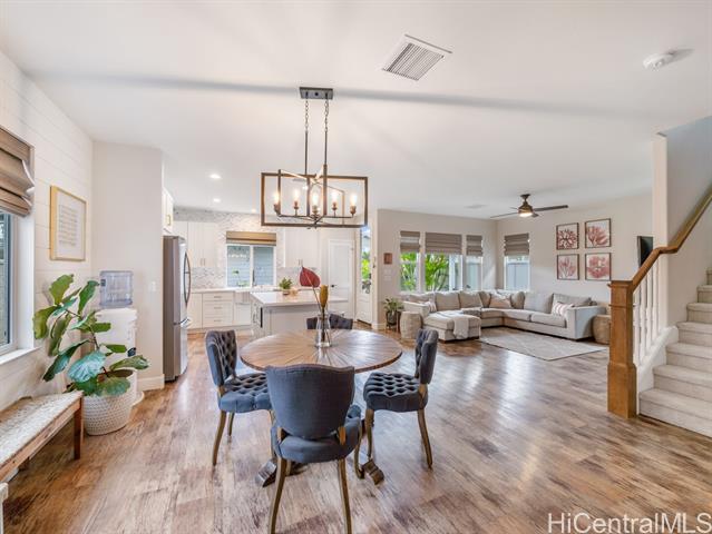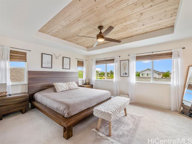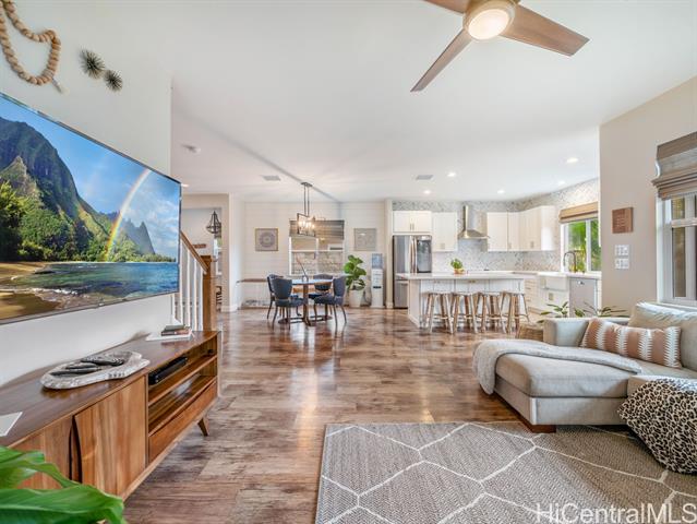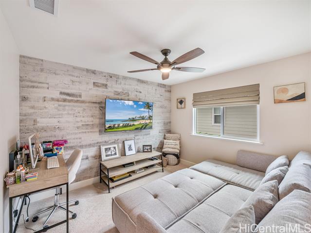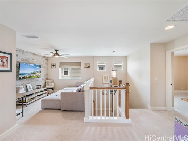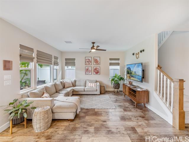 - Enjoy elevated island living in this beautifully upgraded home in the desirable Kuapapa at Hoakalei community. The spacious layout includes a first floor bedroom and full bath, plus an office or study featuring neutral linen wallpaper and custom open shelving. High ceilings and an open concept floor plan design create a bright living and dining area that flows into the fully upgraded modern chef’s kitchen. Upstairs offers a spacious loft with a wood plank accent wall, a large primary suite with a designer tray ceiling, large walk-in closet and primary bathroom with a soak-in tub, two additional bedrooms, bathroom and a beautifully designed laundry room. Fenced-in landscaped backyard features a covered lanai and custom deck, perfect for relaxing and entertaining. The two car garage includes a Chamberlain smart garage system with WiFi, finished concrete flooring, built-in shelving, and wall mounted storage. HOA fees include cable/internet, access to the Wai Kai Hale Club and Kuapapa Swim Club with pool, spa, and BBQ areas. Located near the Wai Kai recreation center, beaches, golf courses, schools, restaurants, and shopping. Tenant occupied. Photos are from previous listing entry.
