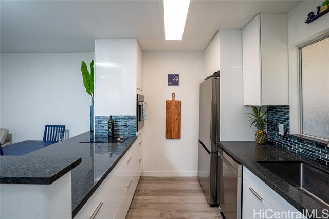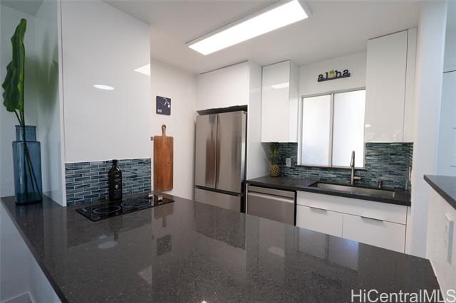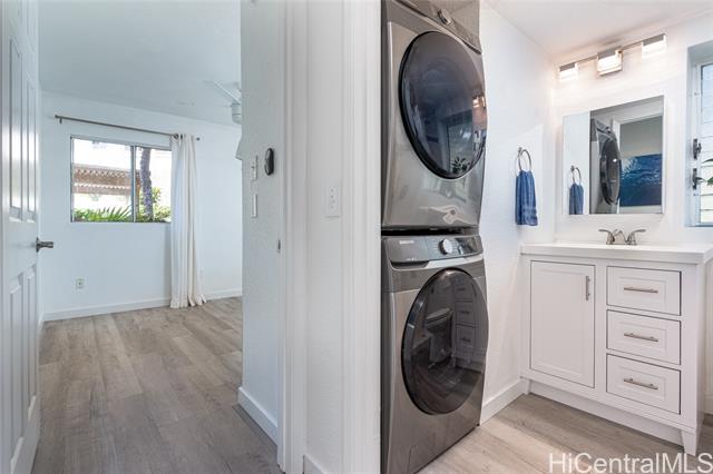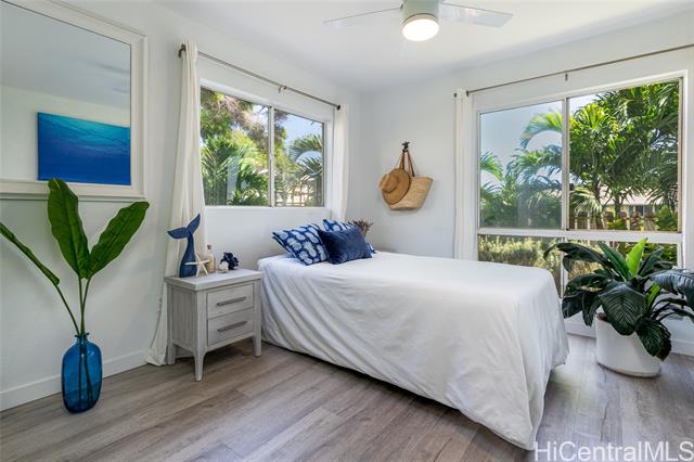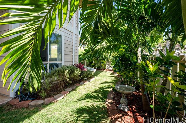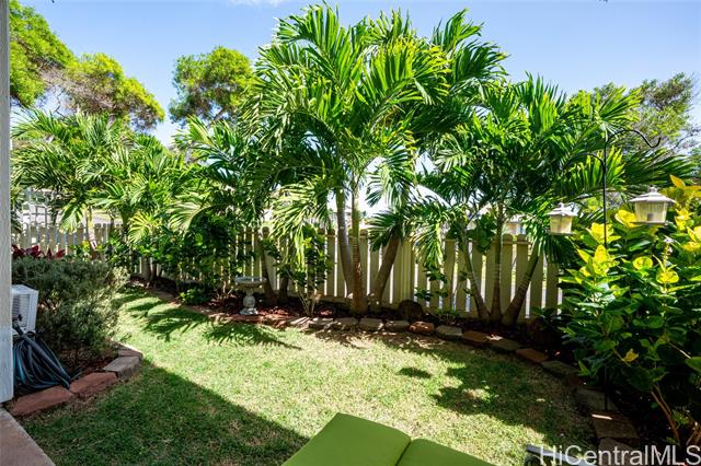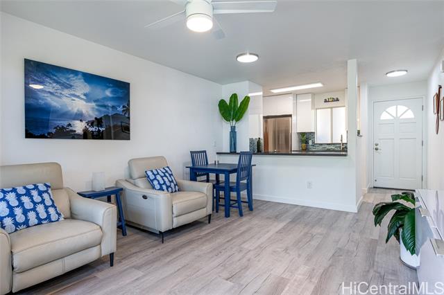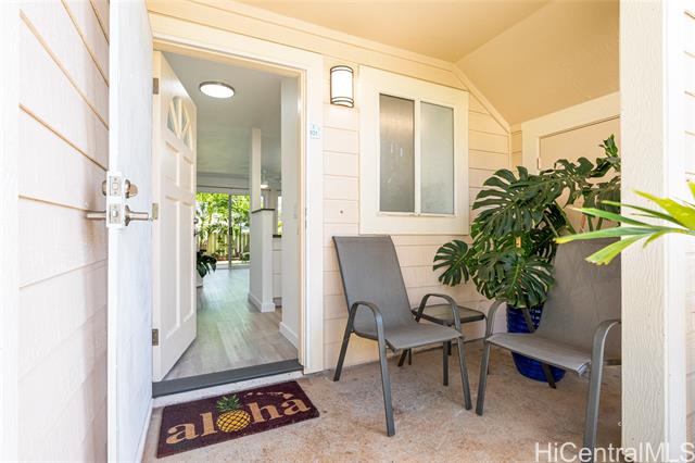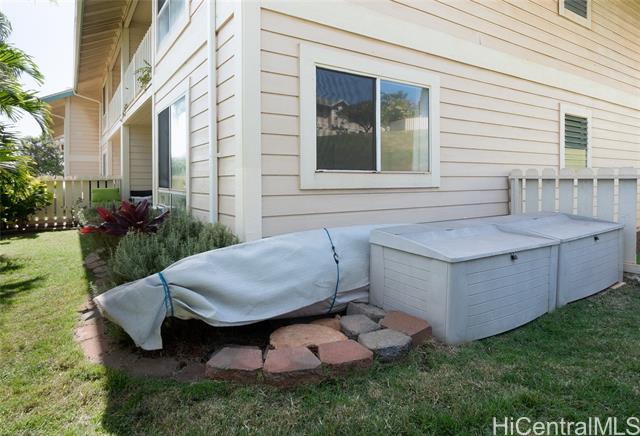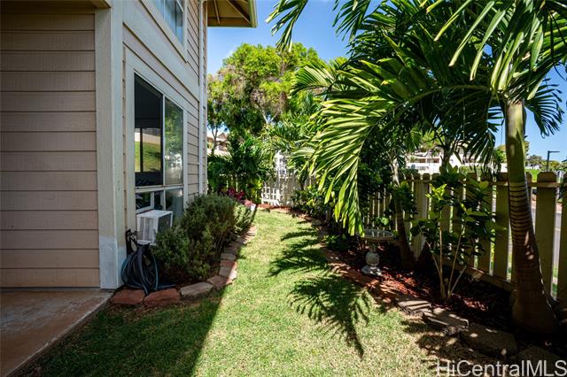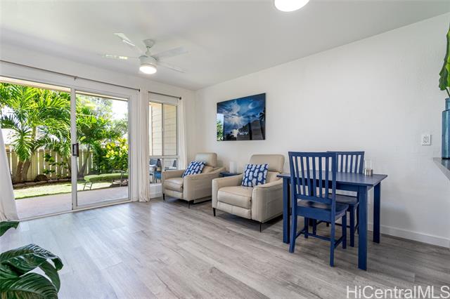 - Love of ownership shines throughout this exquisitely maintained and recently remodeled ground-level corner residence. Bathed in natural light and cooled by refreshing island breezes, the home offers 2 spacious bedrooms and 1 beautifully appointed bathroom with walk-in shower. The elegant kitchen features sleek quartz countertops, updated cabinetry, a built-in cooktop and oven, and dishwasher—perfectly blending style and function. Luxury vinyl flooring flows seamlessly throughout, complemented by window A/C, in-unit washer and dryer, and the convenience of two assigned parking stalls located just steps from the entrance. Outdoors, a wrap-around, fully fenced private yard creates a serene retreat ideal for entertaining, simply relaxing with the Makakilo breezes, or a great spot to play with your pet. The backyard also offers a covered lanai perfect for enjoying your favorite morning beverage or beautiful sunsets as the sky glows over the coastline. This exceptional corner unit offers an effortless blend of comfort, elegance, and island lifestyle with easy access to Makakilo Heights Neighborhood Park uphill and H-1 freeway connections and Kapolei Market.