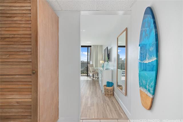 - Rare opportunity to own a newly renovated, turn-key legal short-term rental with deeded parking in one of Waikiki’s most desirable resort locations, offering the perfect blend of investment performance and personal vacation use. High-floor Unit 1022 features a spacious studio layout with a private lanai showcasing sweeping 180-degree views of Diamond Head, the ocean, and the Waikiki skyline—an experience that consistently attracts guests and enhances rental demand. The bright interior highlights modern finishes, updated flooring, stylish furnishings, and an efficient open design that maximizes comfort and guest satisfaction. Located just 1 block from the beach, with shopping, dining, and entertainment nearby, this prime location supports strong year-round occupancy. The unit also features a custom hand-painted mural by local artists, adding memorable island character that helps the unit stand out in the rental market. Owners/guests enjoy boutique-style amenities including refreshed common areas, pool, BBQ, fitness center, on-site laundry, front desk services,& 24-hour security, making this an exceptional opportunity for investors seeking income potential with lifestyle flexibility.