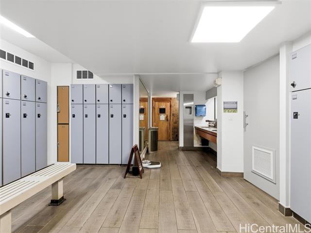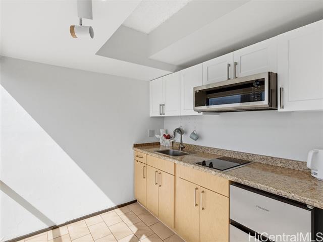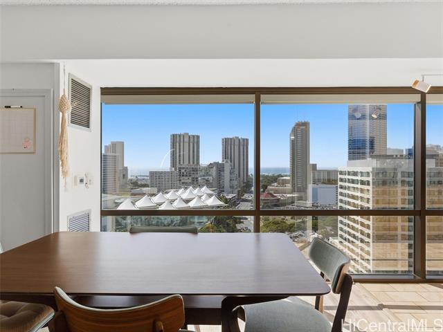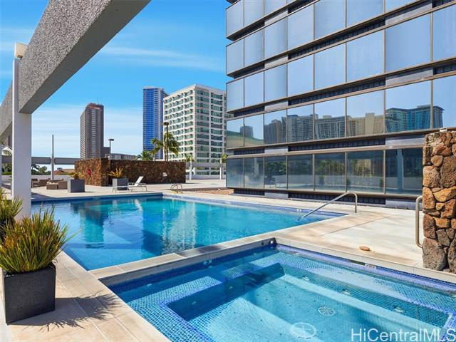 - Beautifully updated studio in a rare mixed-use building, ideal for owner-occupants, professionals, or live/work use. This modern residence features luxury vinyl tile flooring, sleek kitchen and bath cabinetry, central AC, and a cleverly concealed closet for a streamlined layout. Floor-to-ceiling windows provide abundant natural light and are complemented by remote-controlled shades for added comfort and privacy. Residents enjoy resort-style amenities including swimming pool, saunas, private health spa, and recreation deck with sports courts and jogging path. Conveniently located near Waikiki and Ala Moana with easy access to beaches, shopping, dining, convention center, and bus lines. Excellent opportunity to own a turnkey unit in the heart of Honolulu.
