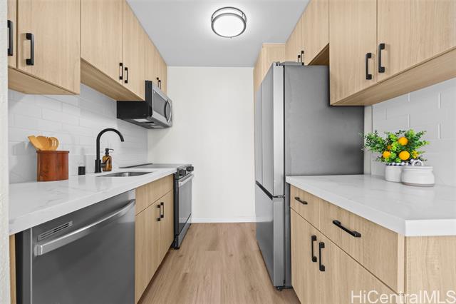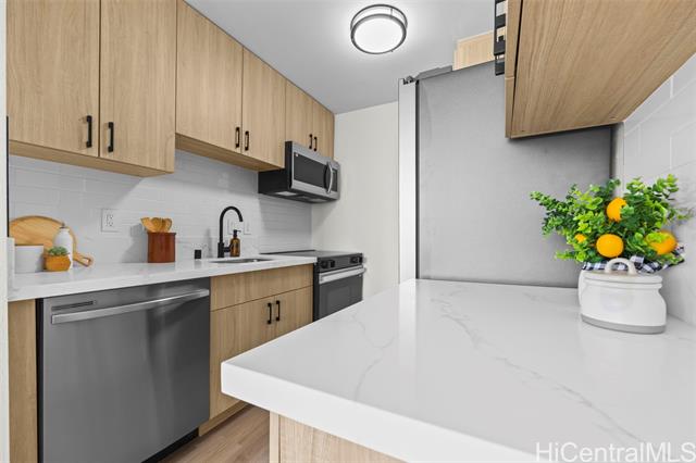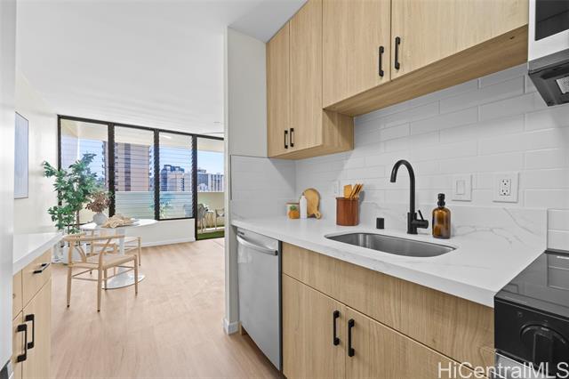 - Move right into this beautifully renovated spacious 1-bedroom, 1-bathroom condo at La Casa in the heart of Waikiki, offering nearly 600 sq. ft. of modern living space and a spacious 100+ sq. ft. balcony with breathtaking ocean, city, and mountain views. Every detail has been thoughtfully remodeled, from the kitchen and bathroom to the bedroom and living areas. The unit features luxury vinyl flooring, freshly painted walls, sleek kitchen finishes with brand-new appliances, a contemporary bathroom, modernized bedroom elements, drain pipes replaced in the bathroom and kitchen, and stylish new light fixtures throughout. This turnkey condo is ready for you to move in and enjoy. Additional conveniences include an in-unit washer/dryer and one secure garage parking stall. La Casa amenities include secure guest parking stalls, an on-site manager, trash chute, car wash area, loading zone, and a rooftop deck perfect for panoramic sunsets and ocean views. This building is VA-approved and pet-friendly, as well as steps from Ritz-Carlton, Cafes, Luxury Row, Hilton Lagoon, Beaches and the Best Restaurants Waikiki can offer. Schedule your private showing today! Vacant & Easy to Show!