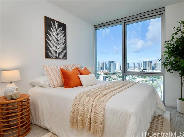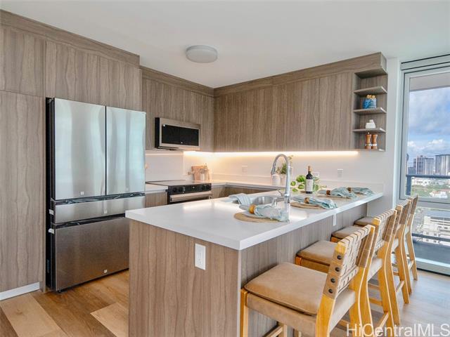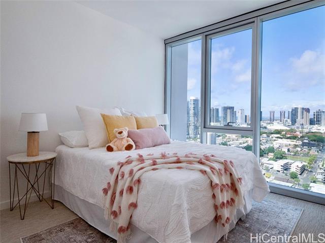 - Experience refined urban living at The Park on Keeaumoku, centrally located with immediate access to shopping, dining, and everyday conveniences. This well-positioned 3-bedroom corner residence offers an ideal balance of space, privacy, and expansive views in the heart of Honolulu. The thoughtfully designed layout features a private primary suite with walk-in closet, two additional bedrooms separated from the primary, and a welcoming entry hallway. The home is finished with a modern aesthetic including wood-grain cabinetry, quartz countertops, and luxury vinyl plank flooring. An open-concept kitchen with island bar connects seamlessly to the living area, complemented by a spacious laundry room. Enjoy ocean, city skyline, and mountain views from the wraparound lanai. Residents enjoy resort-style amenities including a swimming pool with city and ocean views, BBQ and gathering areas, party and entertainment rooms, private movie theater, co-working space, fitness center, EV charging, guest parking, bike storage, and planned street-level shops and dining. Well-priced and thoughtfully positioned, offering a compelling opportunity within the building.