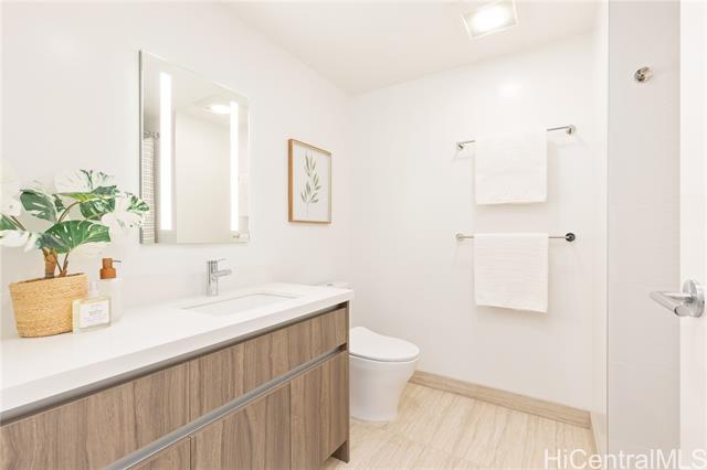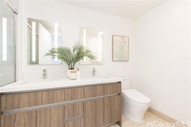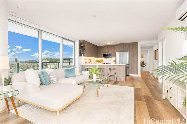 - Live where you work and unwind like you're on vacation. Panoramic views, premium upgrades, and brand-new construction, move in today. Never-occupied 2-bedroom. 2-bath residence featuring stunning city, mountain, and ocean views from a 180-degree wrap around lanai with floor-to-ceiling windows. Owner invested in the upgrade pkg. $16k which includes luxury vinyl flooring in the entrance, hallways, kitchen and living room and carpet in bedrooms with motorized blinds and Toto Washlets. Includes split A/Cs in every room and a bright, open layout. Two assigned, covered, side-by-side parking stalls located near the entrance to the 6th floor. Resort-style amenities include an infinity pool, BBQ pavilions, sauna, dog park, theater room, fitness and yoga rooms, and club rooms for entertaining. Midtown Eats Food Court and playground on the ground level, with Walmart, Sams Club, Tous Les Jours Bakery, and Ala Moana Center nearby. A move-in-ready new constructions opportunity in a convenient urban location. Must see!