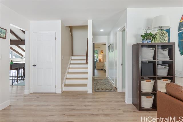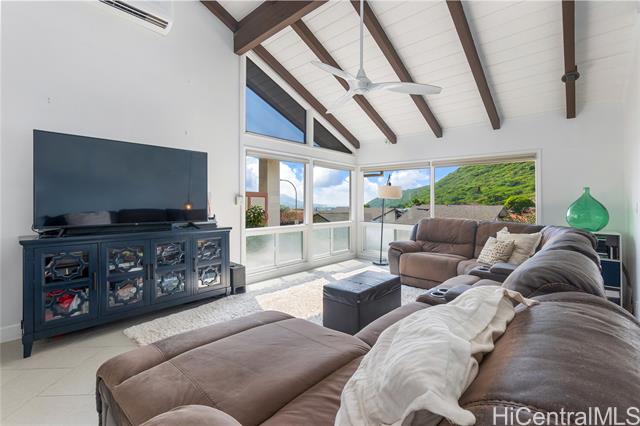 - Nestled in one of East Honolulu’s coveted neighborhoods, Upper Hahaione Valley, this beautifully maintained home offers 2,500+ square feet of comfortable living space in a highly desirable school district. Thoughtfully improved over the past five years, upgrades include the installation of PV panels with battery storage, split AC units in every bedroom and the living area, bathroom updates, new luxury vinyl plank flooring, and a 5-year-old roof for added peace of mind. Designed to embrace natural light and stunning surroundings, the home features a welcoming entry with just a few steps up to the main living room, where picture windows frame ocean, mountain, and city views. The kitchen and primary en-suite bedroom are conveniently located on this level, while three additional bedrooms are situated upstairs. Outdoor living is just as inviting, with a swimming pool and a spacious deck. The lanai from the primary bedroom is perfectly positioned to capture the panoramic scenery. Ideally located just minutes from ocean activities, hiking trails, beaches, shopping centers including Costco, eateries; this exceptional property offers the best of island living. Floor plan available.