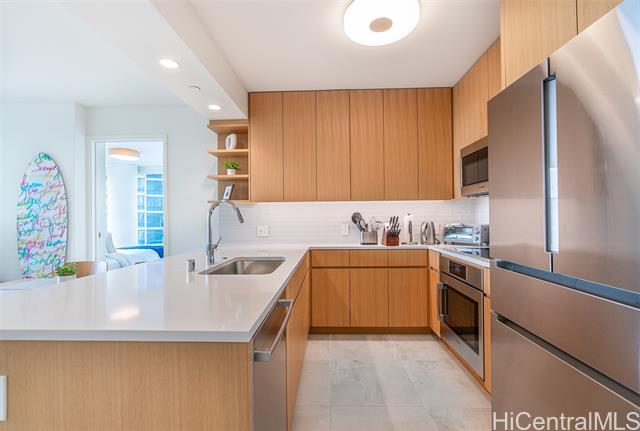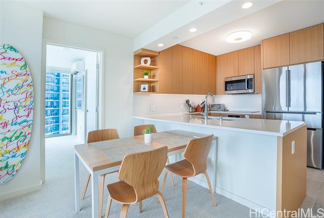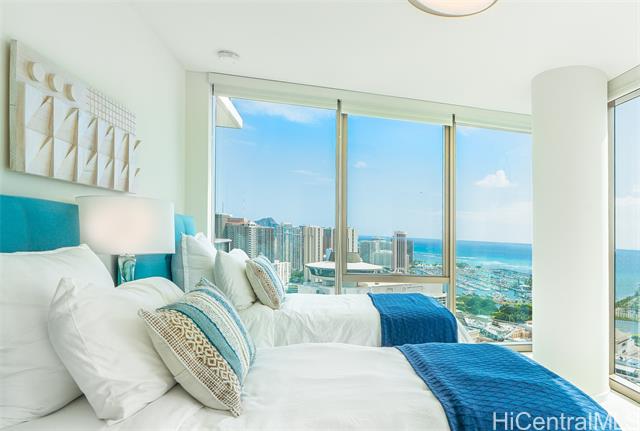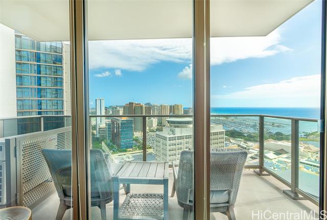 - Enjoy elevated island living at Sky Ala Moana West. Rarely available 01 stack on a high floor, this popular corner residence features floor-to-ceiling windows and a private lanai showcasing sweeping ocean, Diamond Head, city, harbor, and mountain views. The open-concept layout offers a modern kitchen with upgraded finishes and premium appliances, along with thoughtful enhancements including a washlet. Tastefully furnished with high-quality furniture and kitchenware, this turn-key unit is ready for immediate enjoyment, allowing you to start living the island lifestyle right away. Residents enjoy access to one of Honolulu’s largest amenity decks, including pools, fitness facilities, spa areas, and more. Ideally located near Ala Moana Center, beaches, dining, and entertainment—urban convenience meets resort-style living.