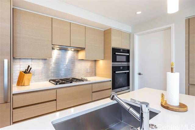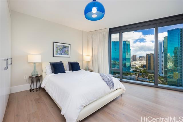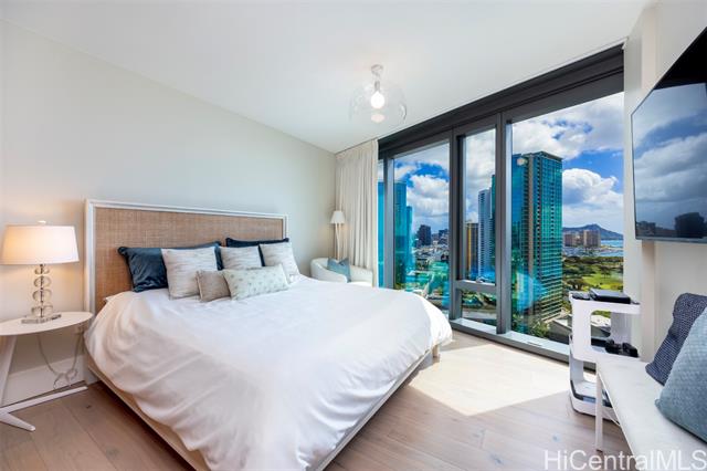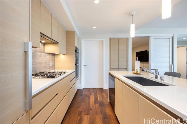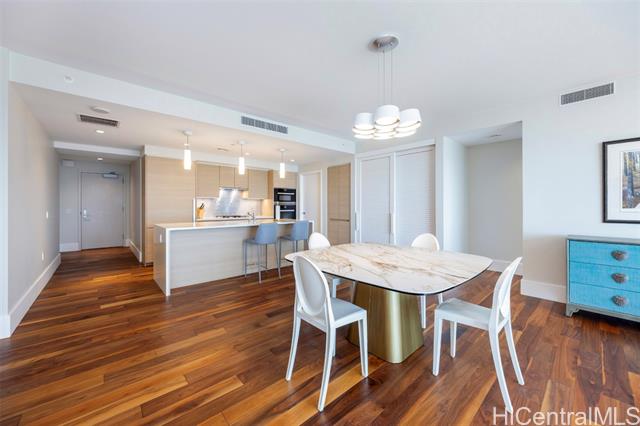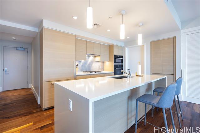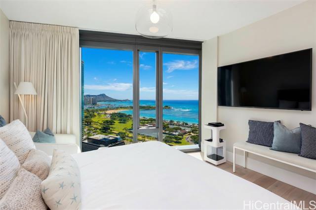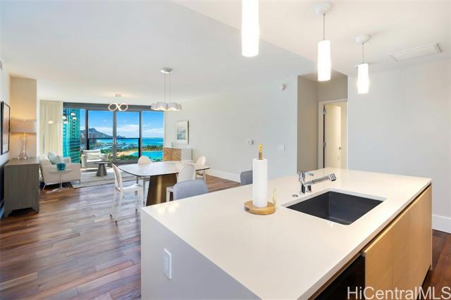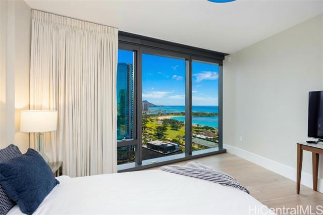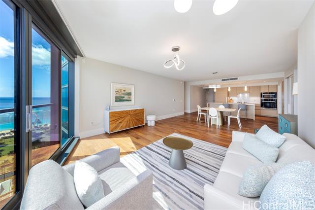 - Island Luxury Living: Anaha #2202 is a Diamond Head-facing residence delivering exceptional modern design and sophistication. Stepping inside this 1,691 sq.ft. home reveals a well-designed 2-bedroom plus den layout, showcasing captivating panoramic views of Diamond Head, the Pacific Ocean, and Ala Moana Beach Park from the living areas and both bedrooms. Anchoring the primary living space, a high-end gourmet kitchen appointed with designer Miele appliances and built-in bar seating seamlessly flows into the spacious open-concept living area. Retreat to the primary suite to discover a resort-style ensuite bath complete with a double vanity, deep soaking tub, a separate walk-in shower, plus an extra-large walk-in closet. Enjoy access to world-class amenities, including the iconic cantilevered glass-bottom pool, cabanas, concierge services, fitness center, and tennis court. Just outside, Ward Village, Ala Moana Center, and Ala Moana Beach Park sit within blocks, where boutique shops, notable restaurants, and sandy coastlines await. An exceptional lifestyle of luxury awaits; this is Anaha #2202.