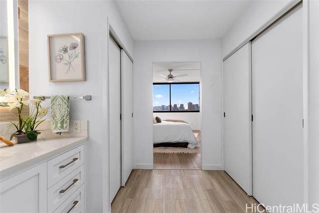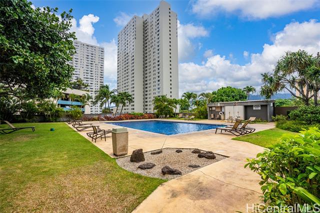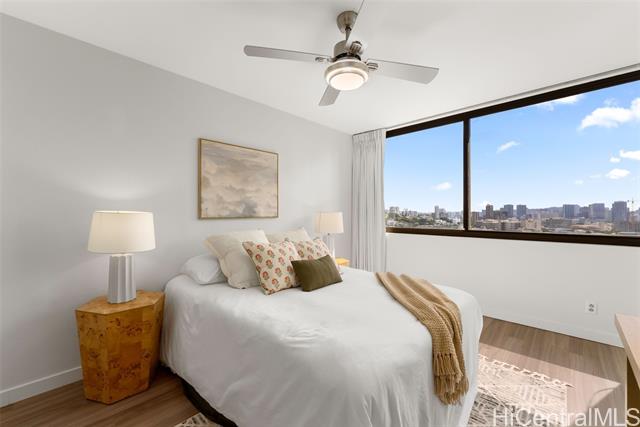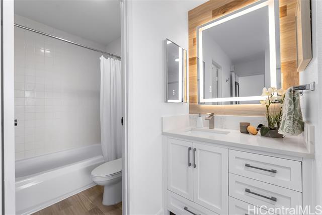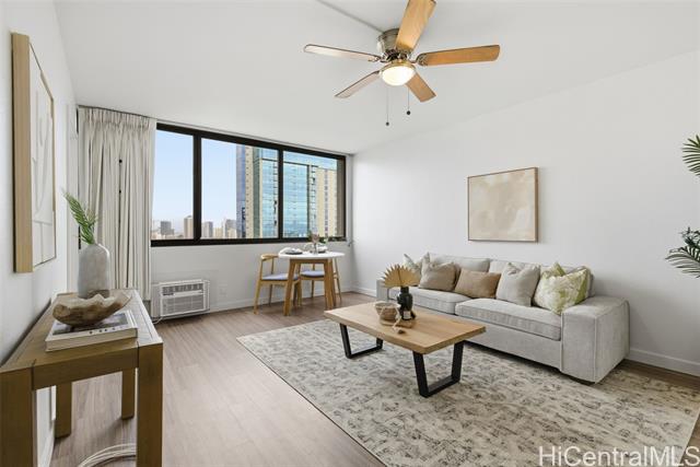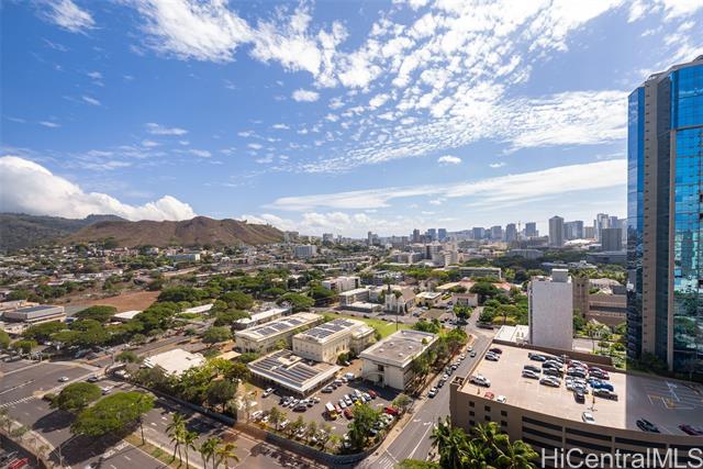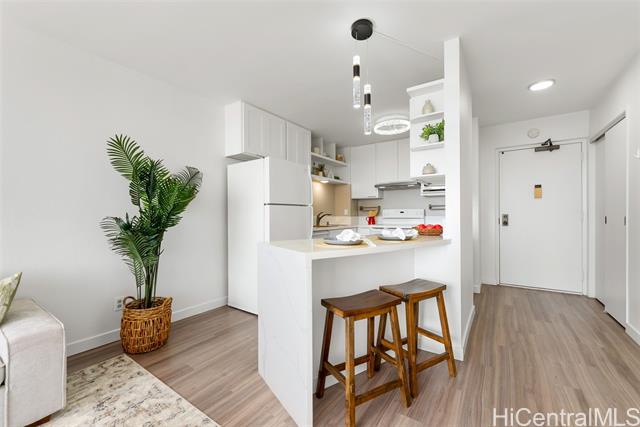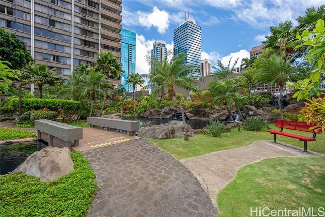 - Enjoy the best of urban living—where comfort meets convenience—in the heart of Downtown Honolulu! This tastefully upgraded 1 bdrm/1 bath condo, ideally located in the preferred Diamond Head Tower at Kukui Plaza, is a must-see. Boasting beautiful mountain and city views, this unit features modern vinyl plank flooring, a refreshed bathroom, removal of popcorn ceiling, and a stunning renovated open kitchen with quartz countertops and a sleek waterfall edge. The open floor plan welcomes abundant natural light, creating a warm and inviting space. Includes 1 covered, assigned parking stall. Kukui Plaza offers resort-style amenities including lush garden courtyards, tranquil ponds, a swimming pool, BBQ areas, 24-hour security, and more. Just moments from shopping, dining, and entertainment. Live the convenient Downtown Honolulu lifestyle!