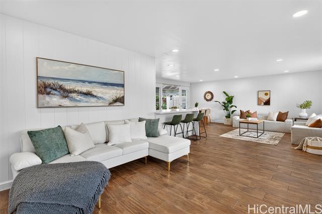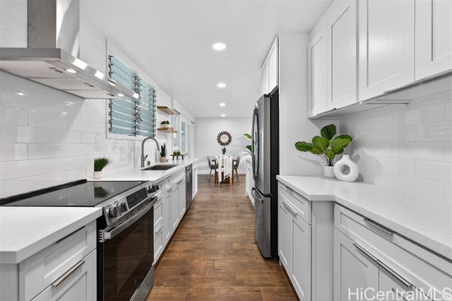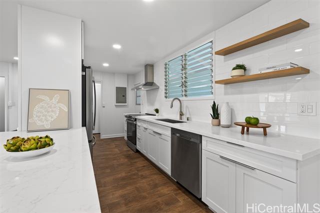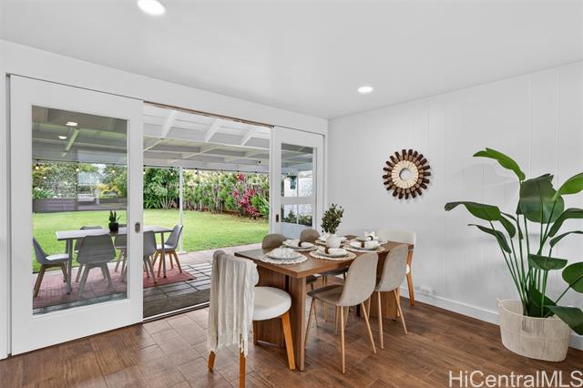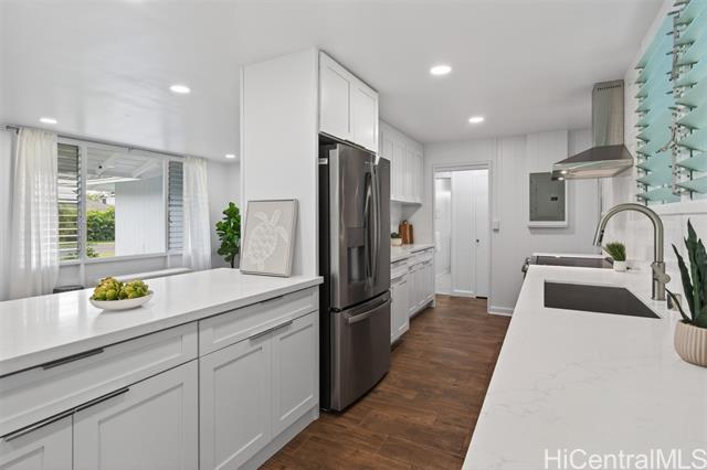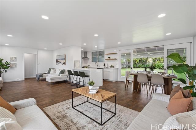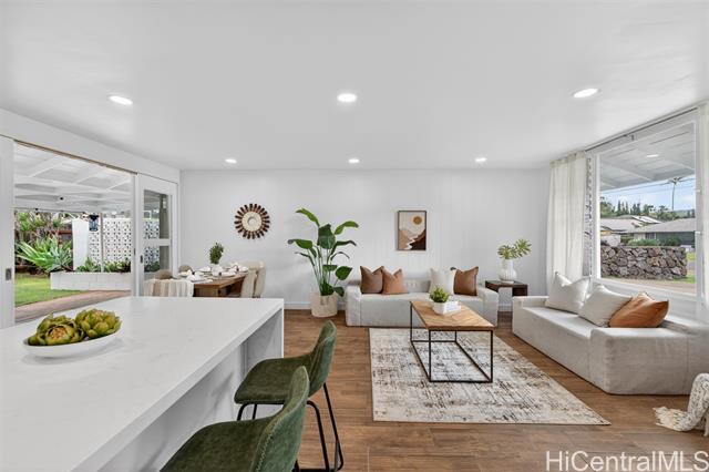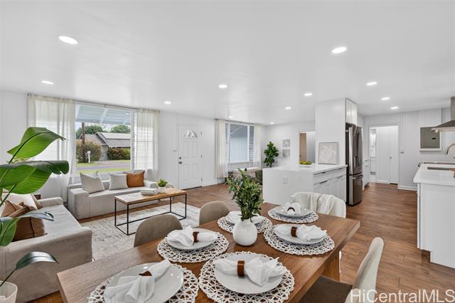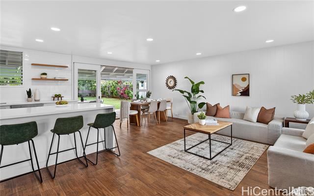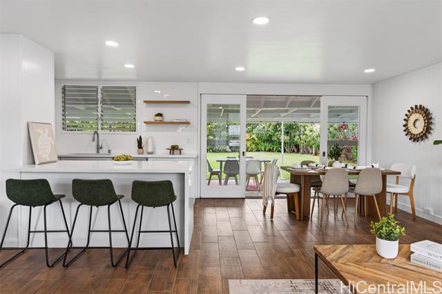 - PRICE REDUCTION!!! Step into effortless coastal living with this beautifully renovated 3-bedroom, 2-bath home just minutes from the beach in one of Kailua's most desirable neighborhoods. Thoughtfully updated with modern finishes, this move-in-ready residence blends style, comfort, and functionality in every space. The open-concept layout features a modern kitchen with quartz countertops, white shaker cabinetry, stainless steel appliances, and a large island that flows into the living and dining areas. Large sliding doors lead out to the over 500 square feet of covered living area creating the perfect extension of your outdoor space. The expansive backyard framed by tropical landscaping is perfect for entertaining and ideal for gardening or just relaxing. Generous exterior storage spaces and an attached 1 car garage complete this move-in ready home. Whether you're looking for a full time residence or a relaxing get-away, this property is ready to become your special home!