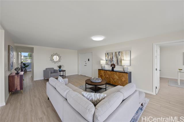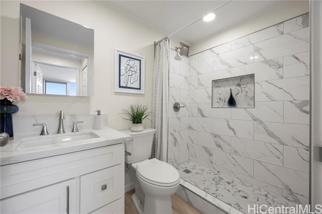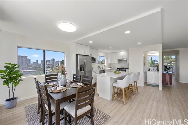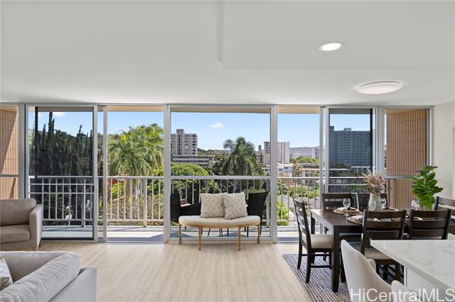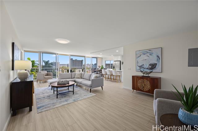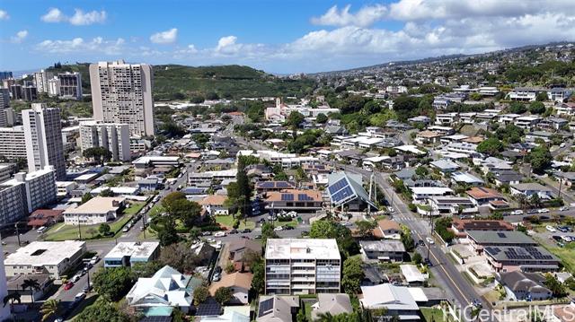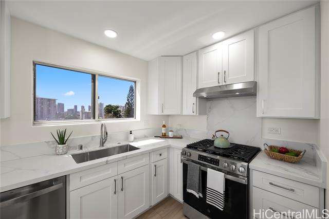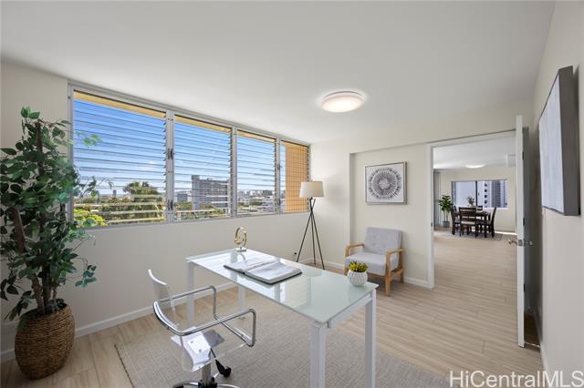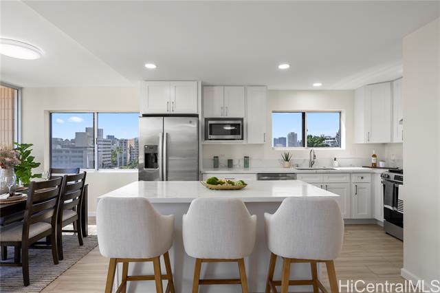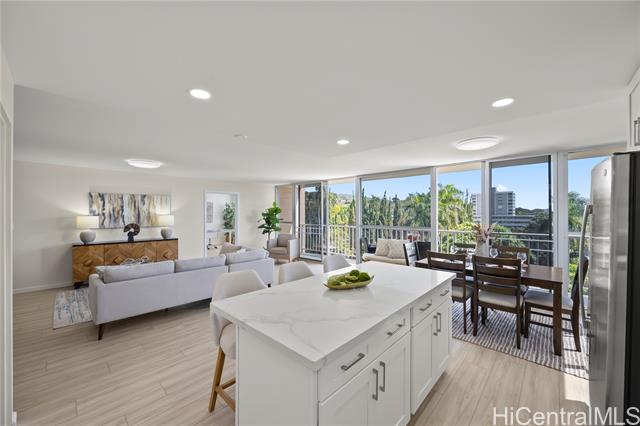 - Penthouse residence in Maikiki Hillside with wraparound views facing east toward Diamond Head and west toward Punchbowl. This property is divided into two separate units. The main residence has 2 bedrooms plus an additional den that can serve as a 3rd bedroom and 1.5 baths. The secondary unit has 1 bedroom and 1 full bath. Both units have their own entrance to the hallway and are used separately. Enjoy large lanais stretching the expanse of the residence on both the east and west sides of the building, totaling over 275 square feet. The main unit is completely remodeled with a new kitchen and baths, featuring quartz counter tops, white hardwood cabinets, recessed lighting, a smooth-finish ceiling, luxury vinyl flooring and new fixtures throughout. The secondary 1-bedroom unit was also updated with quartz countertops, maple shaker cabinets and luxury vinyl flooring. The access to both ends of the building provides excellent cross-ventilation and privacy. The maintenance fee covers both units and includes electricity, gas, hot water, water, and sewer. Community laundry is available for each unit. Comes with 1 assigned covered parking stall close to the building entrance.