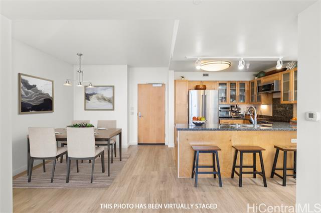 - Welcome to Keola Lai! Located in the vibrant heart of Kaka‘ako, this 2-bedroom, 1-bath condo offers the perfect blend of comfort, convenience, and the best of Honolulu city living. Built in 2008, this unit has been well maintained and is move-in ready! Enjoy resort-style amenities including a tranquil pool and spa, fitness center, and outdoor BBQ areas! Take advantage of the close proximity to SALT at Our Kaka‘ako, H-Mart, and many of Honolulu’s top dining spots. The best of urban lifestyle right at your doorstep. *Some photos have been virtually staged*
