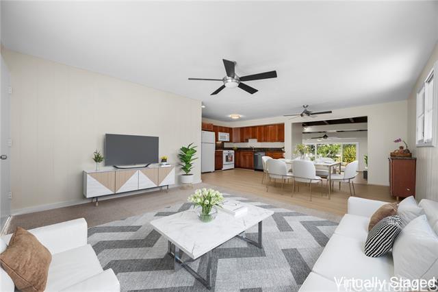 - Welcome to island living in the heart of Keolu Hills! This charming 3-bedroom, 2 bath home with enormous bonus room offers comfort and space. Set behind lush tropical landscaping, this home features a spacious driveway with covered carport that could also be easily used as outside living area. There is a welcoming front and side entrance. Inside, you'll find a bright and functional layout with plenty of natural light, island breezes, and new vinyl flooring. Freshly painted interior and exterior. The property sits on a generous lot with room to garden, entertain, or create your own oasis. Enjoy the convenience of being just minutes from world-famous beaches, local shops, restaurants and parks while still tucked into a residential neighborhood. Come and discover your piece of paradise in Kailua.