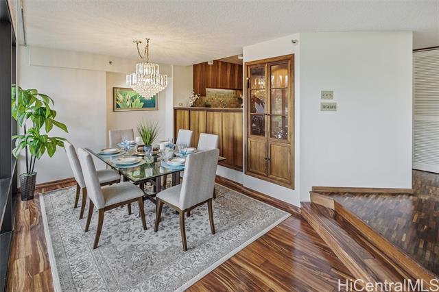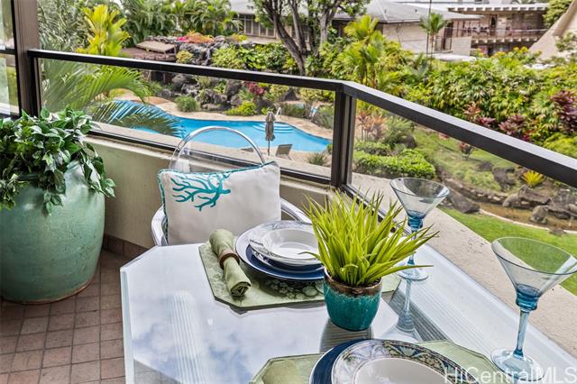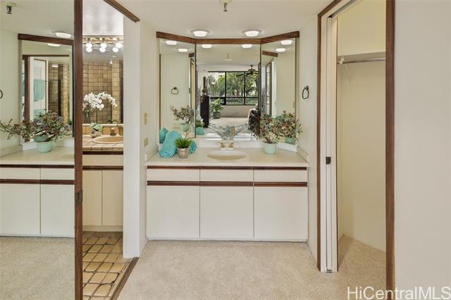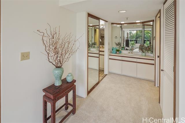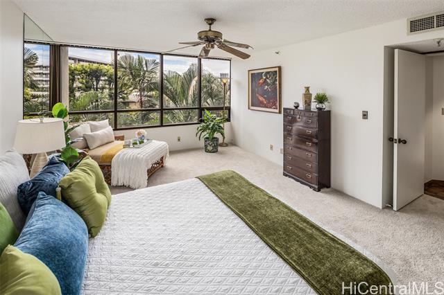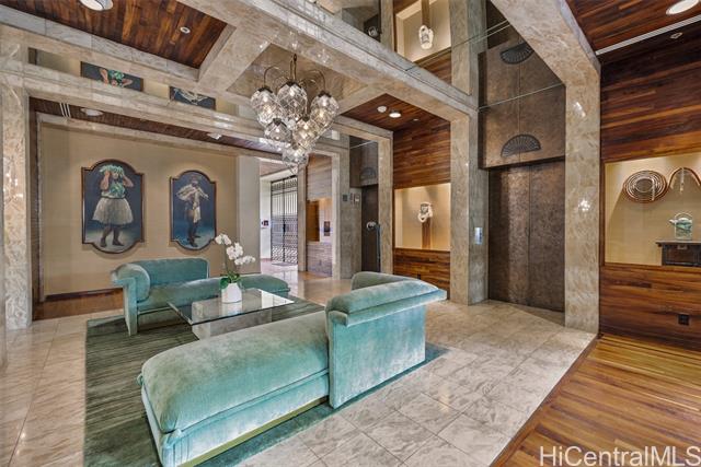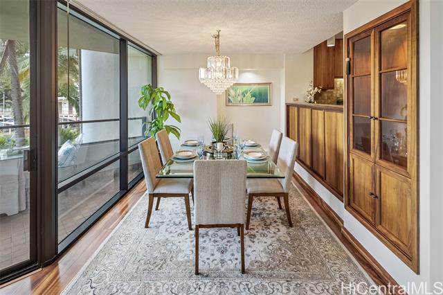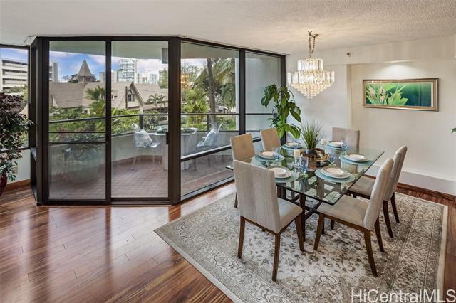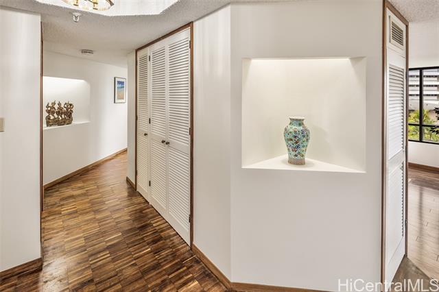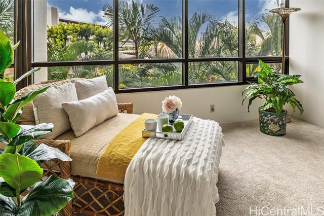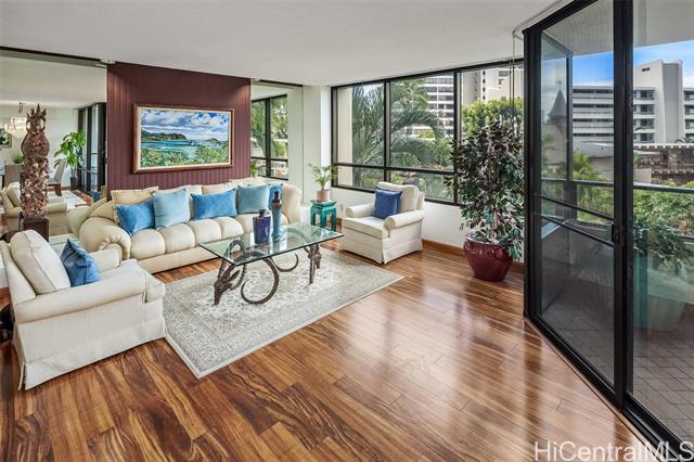 - Experience refined island living in this beautifully appointed 2-bedroom, 2-bath residence on the preferred side of the building, overlooking the lagoon-style pool, spa, and lush tropical gardens from an abundance of windows. This unit, originally the model, showcases renowned exotic koa wood cabinetry throughout the kitchen, dining, and living areas, creating a sophisticated ambiance unique to Hawai‘i. A modern entryway and hallway with art niches set the tone for this home. The open layout flows seamlessly to a private covered lanai—perfect for morning coffee or sunset relaxation amid serene garden and pool views. The primary suite offers a true retreat, complete with an en-suite bathroom, walk-in closet, and an additional lounging space ideal for reading or relaxing. The second bedroom with views of greenery doubles nicely as a guest room or home office. There is a Wine Cellar/meeting room complete with your own cave and table for wine tasting. The home includes central AC, two tandem parking stalls and private storage in the gated garage. The grounds, lobby, and elevators are impeccably maintained. Located close to Punahou School, University of Hawaii, and easy freeway access.