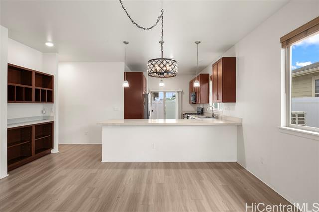 - Highly desirable single-level 3 bedroom, 2 bathroom home located in the master-planned community of Ho‘opili. This well-maintained residence features an open concept layout with luxury vinyl plank flooring throughout the main living areas and carpeted bedrooms for added comfort. The modern kitchen is appointed with upgraded countertops and ample cabinetry, ideal for both everyday living and entertaining. Enjoy year-round comfort with split AC units in every room. The attached garage includes overhead storage, maximizing functionality and space. Conveniently located near parks, walking paths, shopping, dining, and easy access to major roadways and the Skyline. A great opportunity to own a single level home in one of Ewa Plain’s most sought after communities.