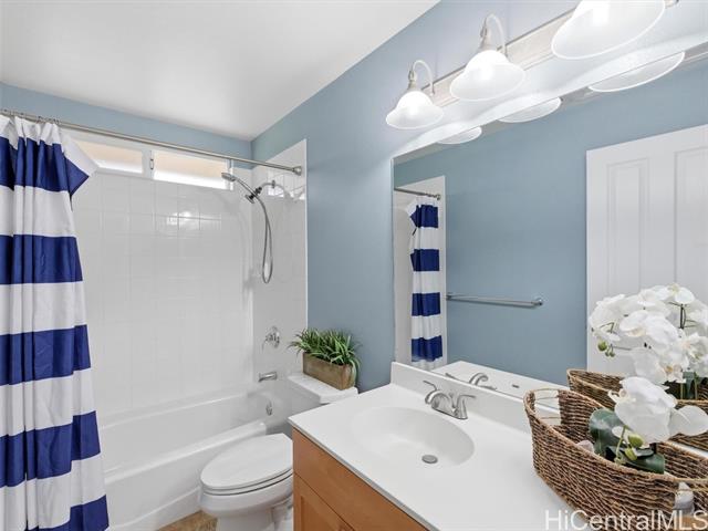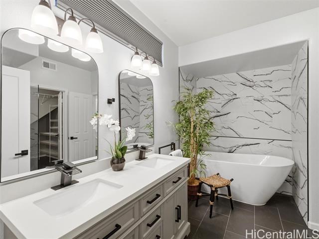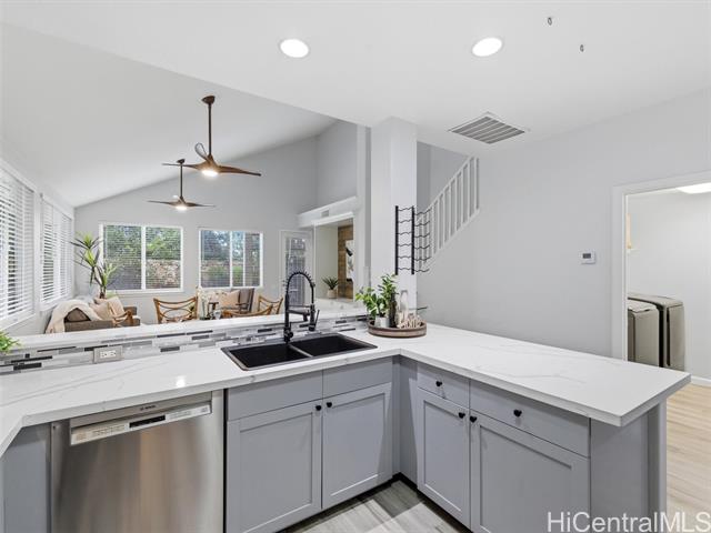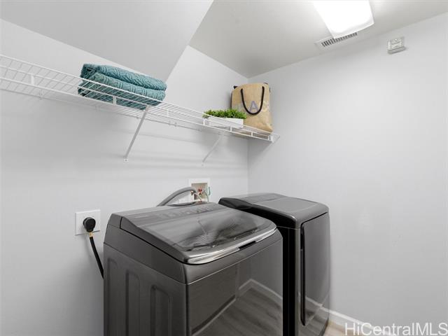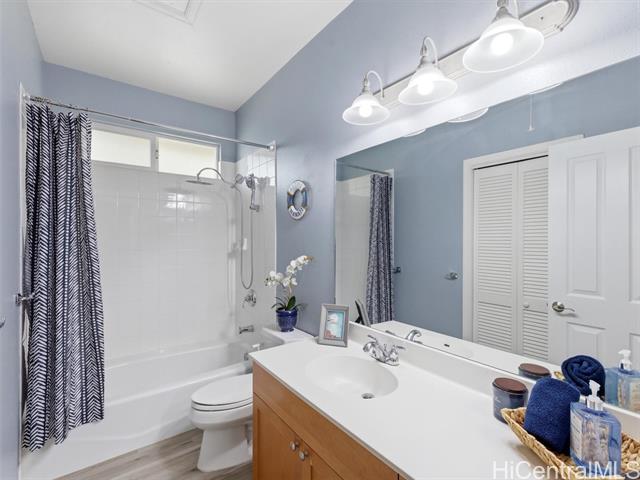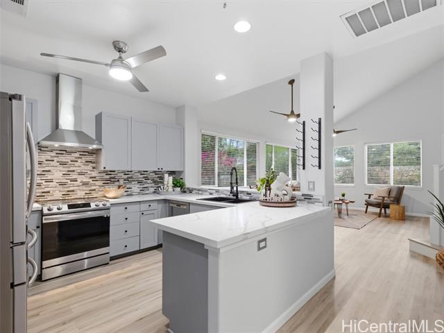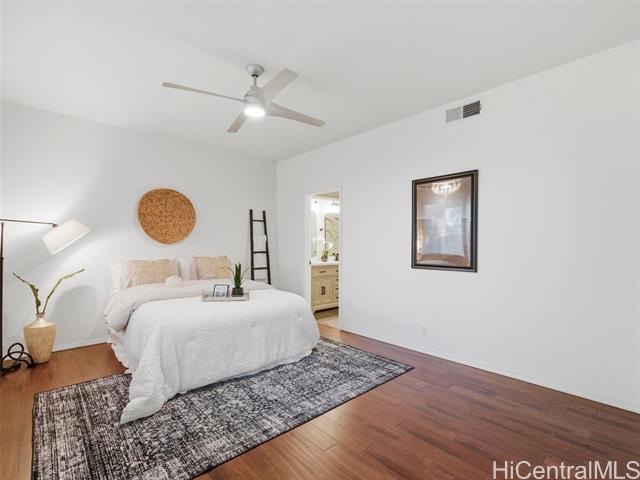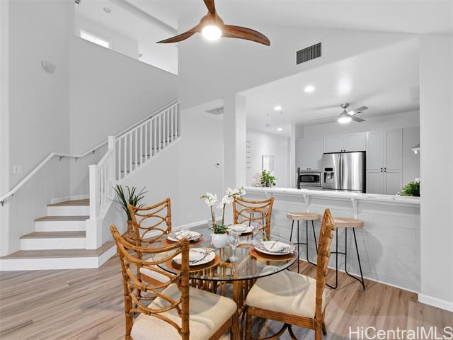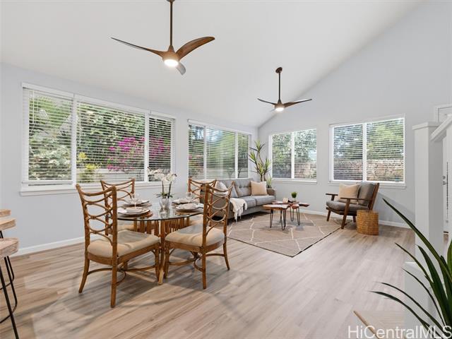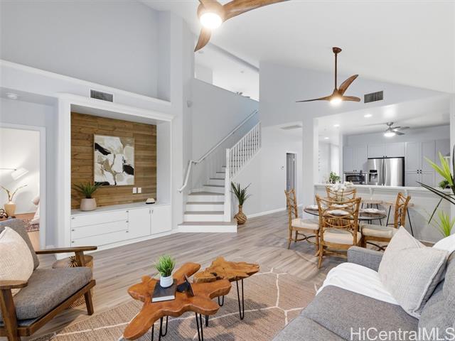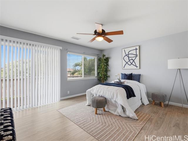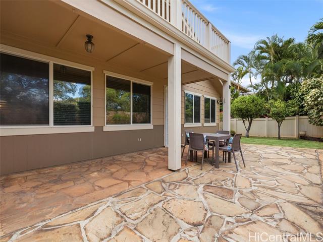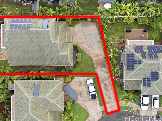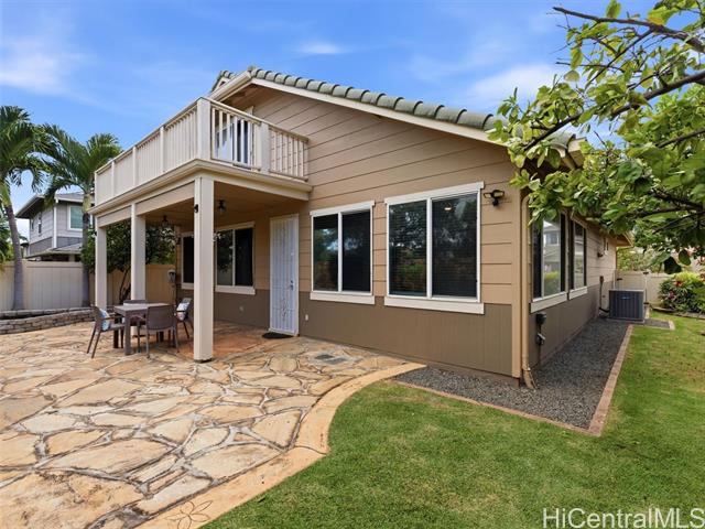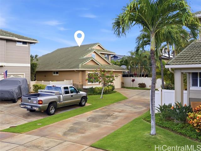 - VA ASSUMABLE LOAN of 4.5% to qualified VA buyers. Welcome to elevated island living in the gated community of Hu'elani in Ewa Beach. Situated on a prime corner lot, this pristine, modernly renovated 3-bedroom, 3-bath home offers flexibility and style. Two bedrooms and two full baths are conveniently located on the ground floor, ideal for guests or multigenerational living. Upstairs, a spacious bonus area provides endless possibilities. The contemporary kitchen opens seamlessly to a spacious living area and flows out to a covered lanai and beautifully manicured garden, creating effortless indoor-outdoor living. A rare long driveway provides additional parking and enhanced privacy. Adding even more value are 10 owned solar panels and a solar water heater, helping to significantly reduce monthly electricity costs and improve energy efficiency. Residents enjoy resort-style amenities including a clubhouse, covered BBQ and dining areas, community pool, fitness center, and walkable sidewalks throughout. A safe, welcoming neighborhood where neighbors connect and children play freely.