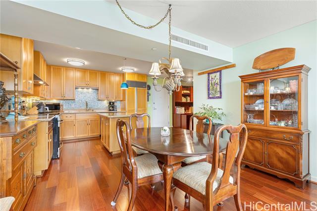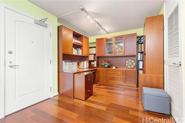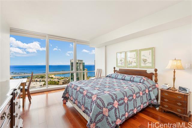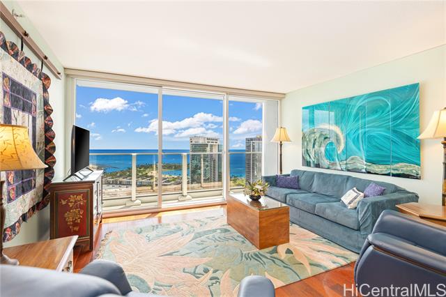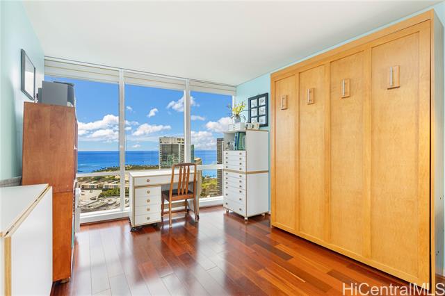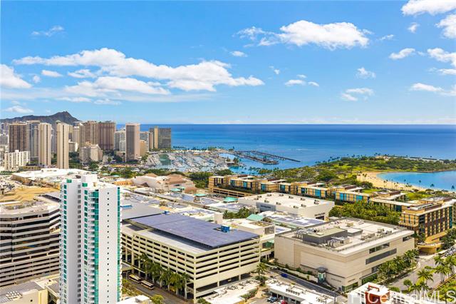 - Broker's Open on 3/4, 9:30 am to 11:30 am. Public Open House on 3/8, 2;30pm to 5:30 pm. Must see unit with great value showing the pride of ownership. Desirable "E" model with 2-bedroom, 2-bath, ready to move-in features a bonus den with office furniture for a professional who works remotely from home. The open-concept layout is enhanced by floor-to-ceiling windows that capture panoramic views of Diamond Head, the Harbor, and the ocean. Residents have access to exceptional amenities, including 24/7 security, a swimming pool, a movie theater, putting greens, a playground, recreation areas, BBQ cabanas, tennis and pickleball courts, a well-equipped fitness center, and guest parking. Pet-friendly building conveniently located near Ala Moana Center, Ward Village, dining, shopping, and beaches. Unit comes with a storage and two side-by-side parking stalls near the elevator.