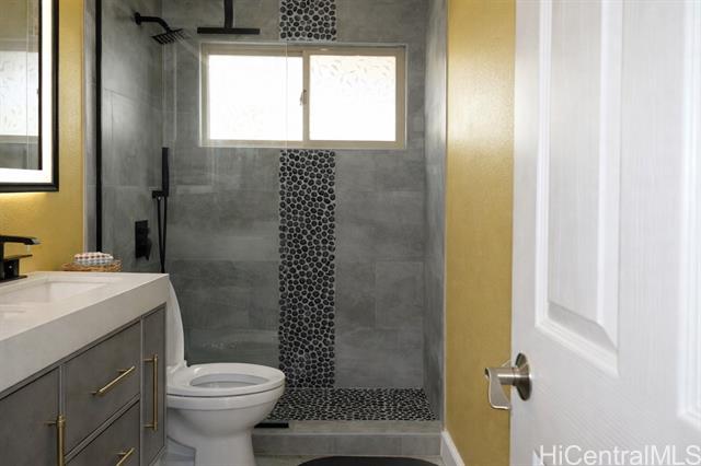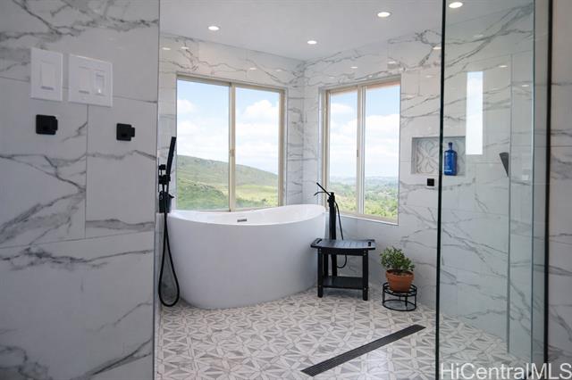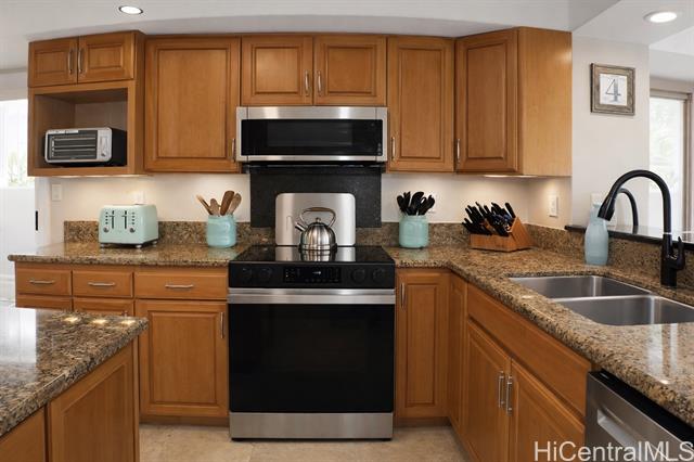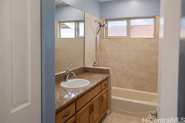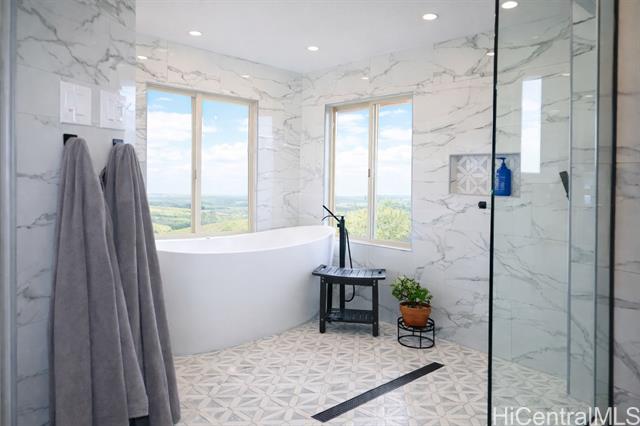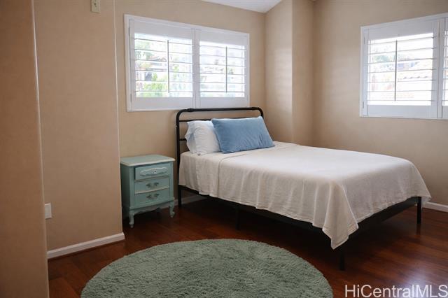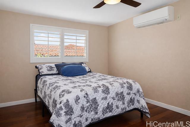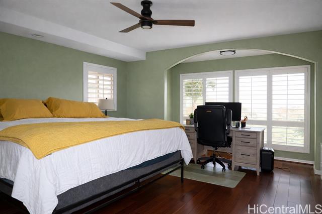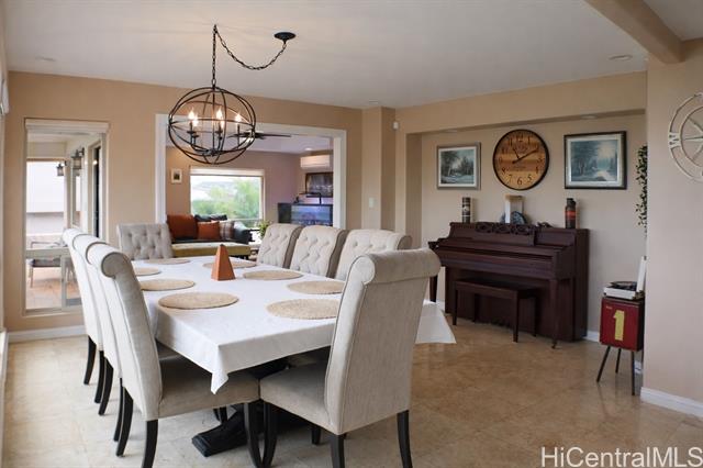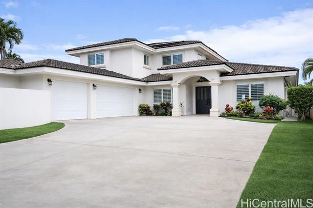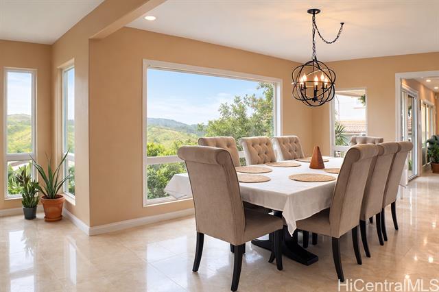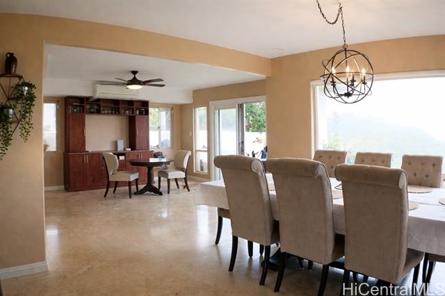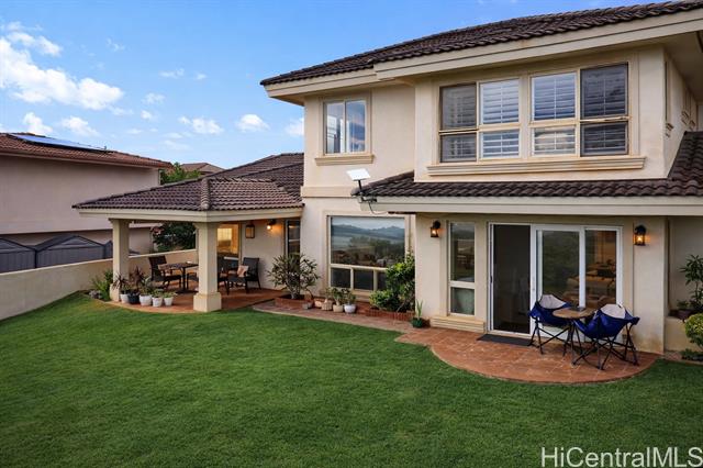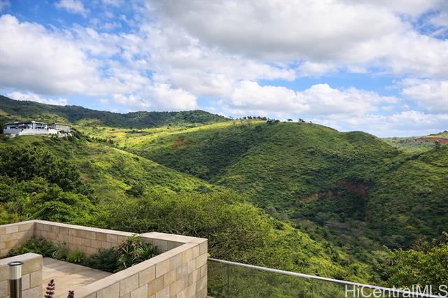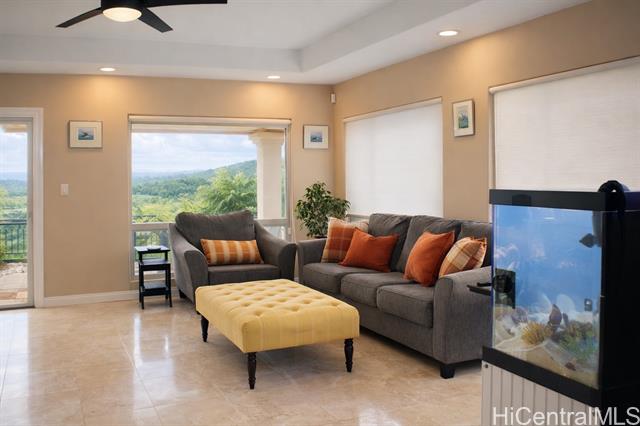 - Perched in desirable Makakilo, this stunning 6-bedroom, 3-bath luxury home offers breathtaking panoramic views from Pearl City to Honolulu, with beautiful city lights at night and cool island breezes year-round. With no back neighbor, the property backs to a peaceful valley with untouched natural beauty, creating exceptional privacy. The flexible floor plan features remodeled bathrooms, engineered hardwood flooring throughout the 2nd floor and bedroom #5 downstairs, and travertine flooring on the 1st floor and bathrooms. Elegant plantation shutters and three Pella sliding doors with built-in mini blinds add style and functionality. Stay comfortable with 8 split A/C units and 7 ceiling fans. Energy efficiency is enhanced by a 47-panel owned PV system (41 for the home, 6 for the water heater). Additional features include whole-home water purification, surround sound, and a well-maintained yard with sprinkler system. The home also offers a 3-car garage and spacious driveway for additional parking, making this Makakilo view property a rare opportunity.