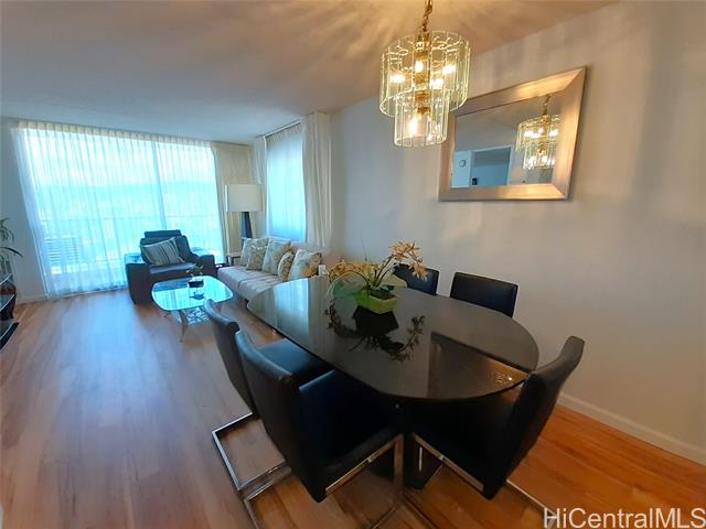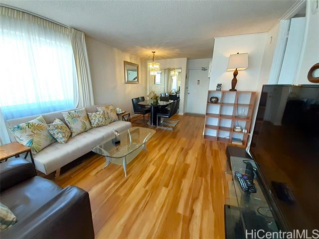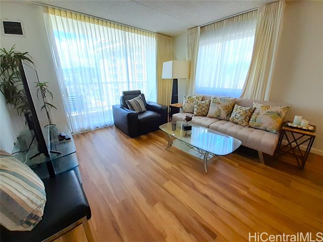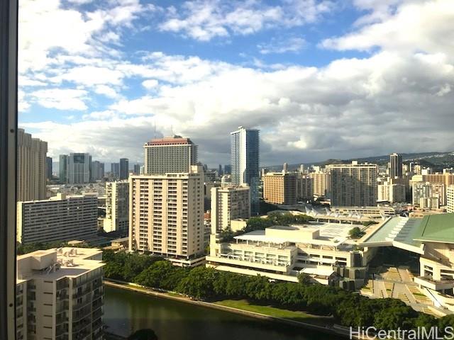 - Enjoy elevated island living in this beautifully remodeled high-floor corner 1-bedroom, 1-bath residence with secured parking at Villa on Eaton Square. Perched on the 26th floor in a desirable corner stack, this unit features an additional side window that enhances natural light and captures cooling trade winds. Take in sweeping panoramic views of the ocean, Ala Moana Beach Park, Magic Island, boat harbor, Ala Wai Canal, mountains, and city skyline from your private lanai. The interior has been thoughtfully updated with new flooring, fresh paint, and upgraded appliances, offering a clean and modern feel. Villa on Eaton Square is known for its exceptional rooftop amenities on the 37th floor, including a saltwater pool, sundeck, BBQ areas, fitness center, sauna, and recreation spaces with breathtaking 360-degree views of Honolulu. Ideally located at the gateway to Waikiki, just moments from beaches, dining, shopping, and Ala Moana Center, with Eaton Square Shopping Center next door. Maintenance fee includes central AC, electricity, hot water, water, sewer, and basic cable. Long lease through 2049.